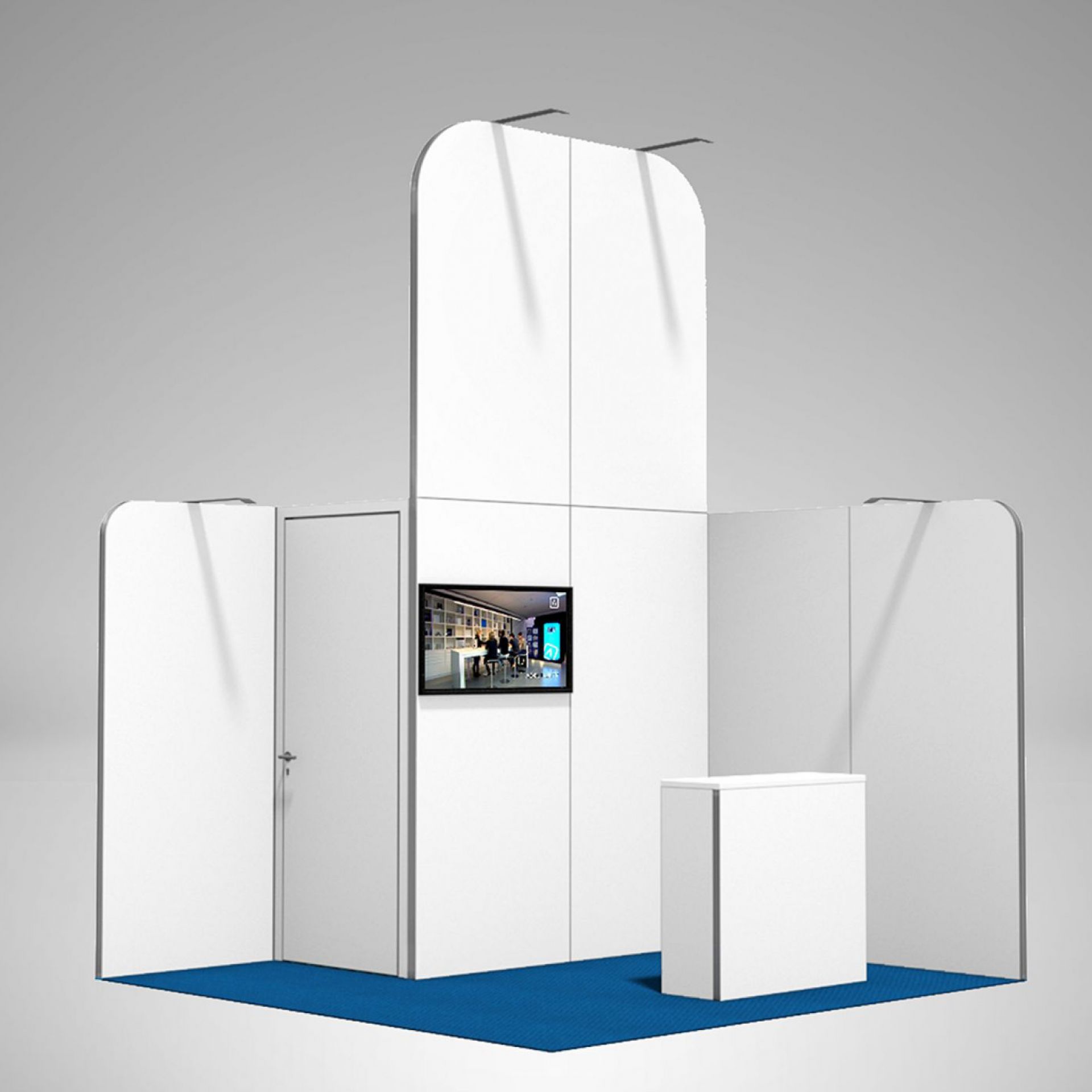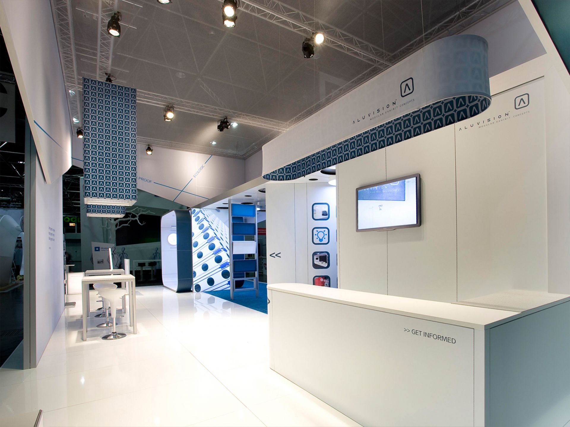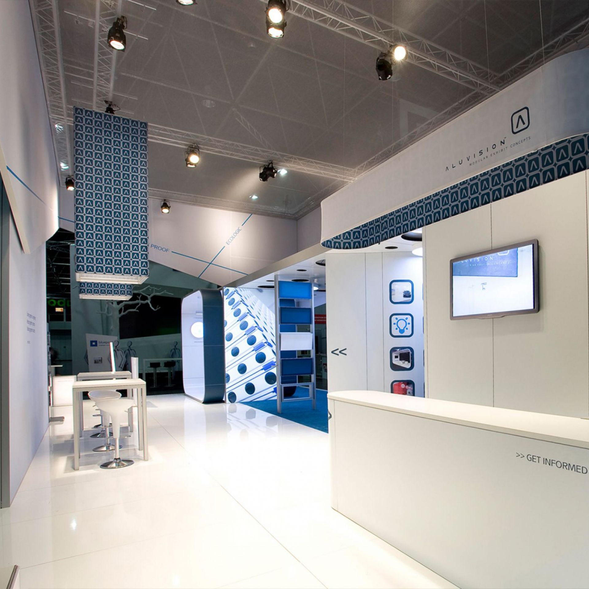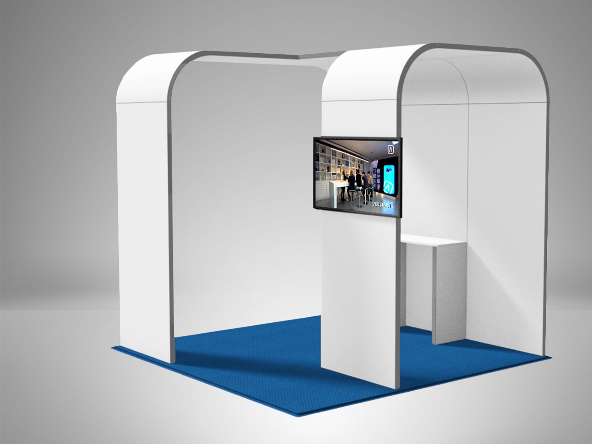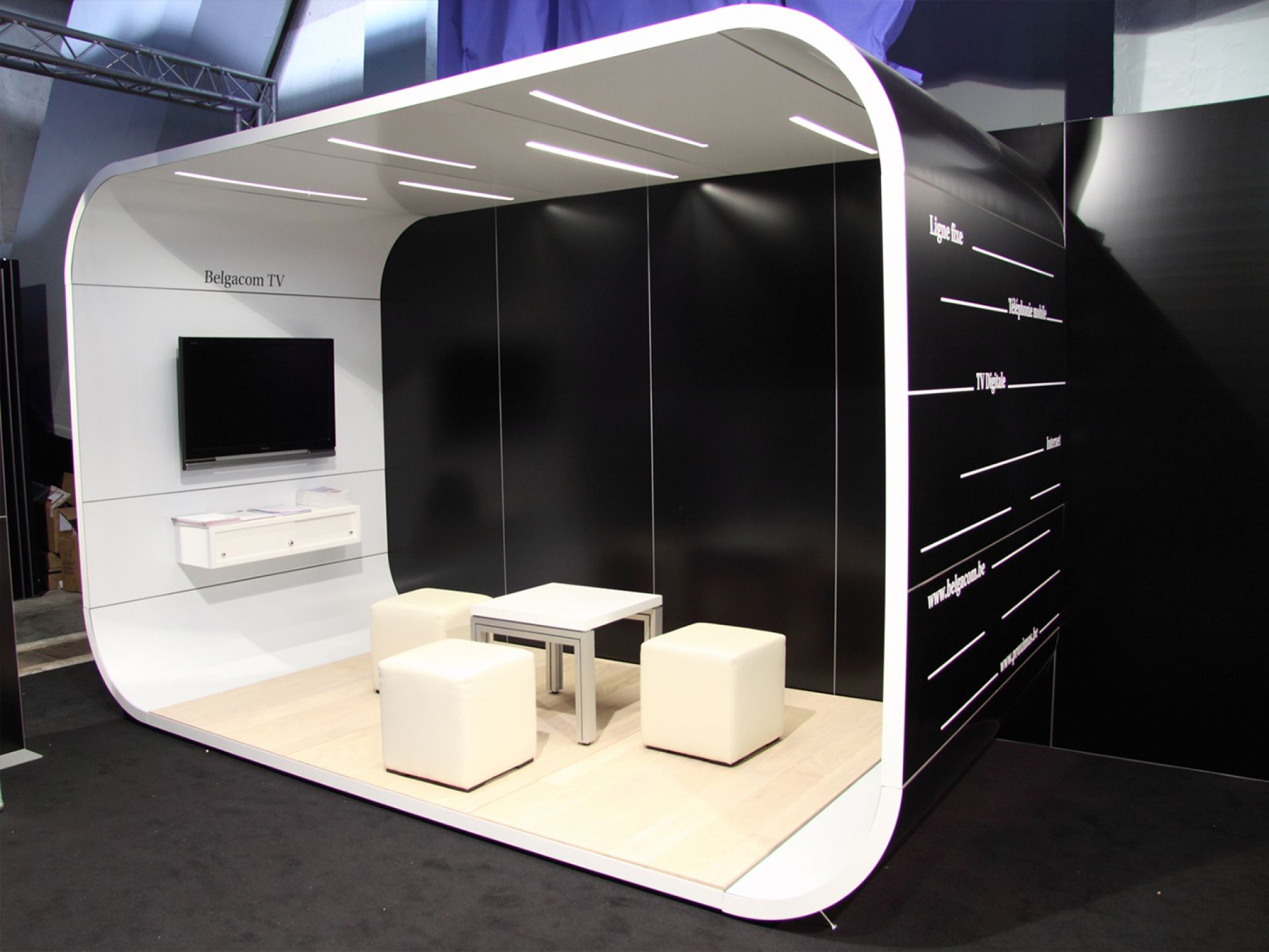 Modulaire et évolutif : les cadres se connectent entre eux et les accessoires optionnels tels que TV, étagères, éclairage transforment les cadres en stands d'exposition.