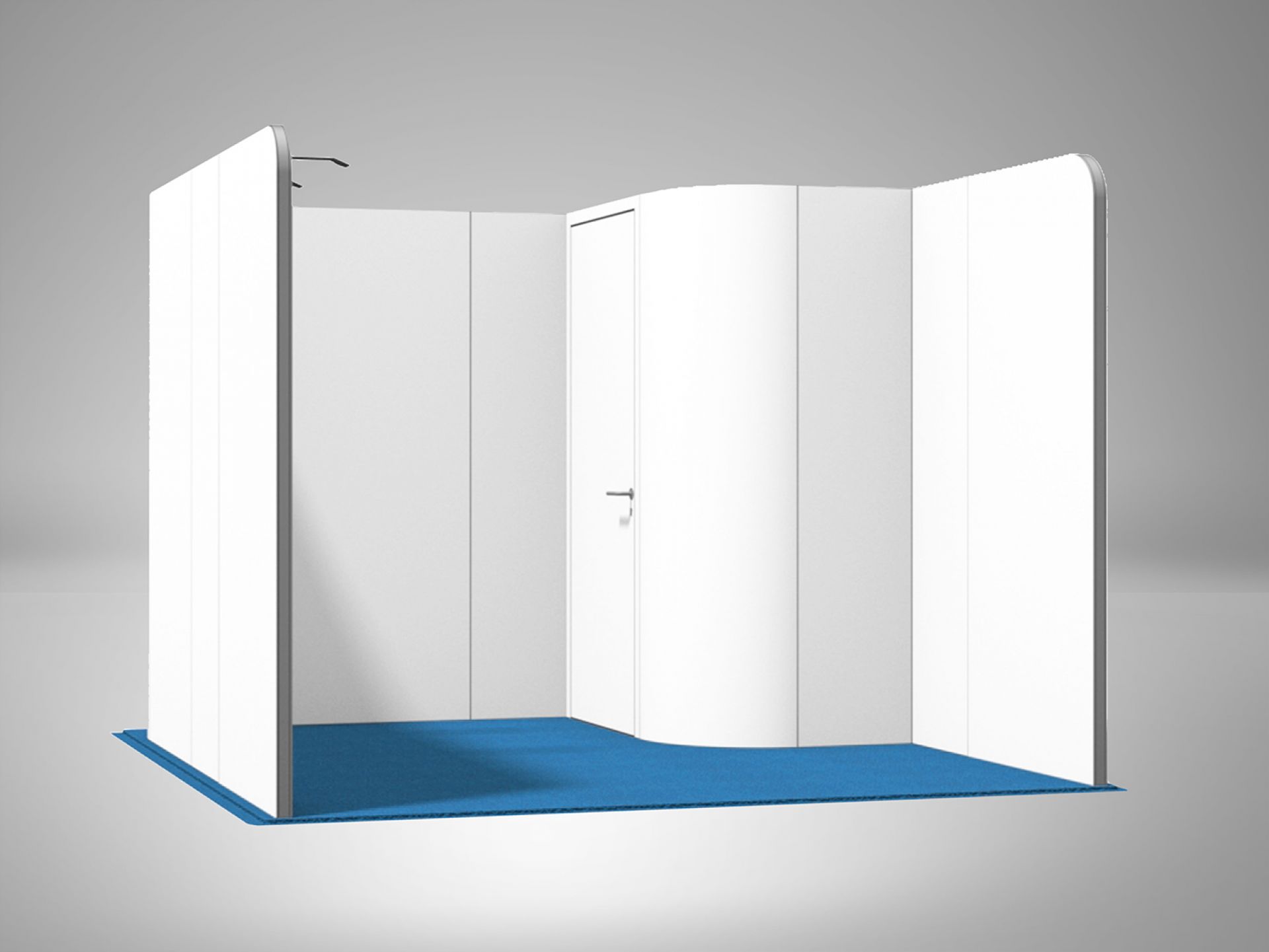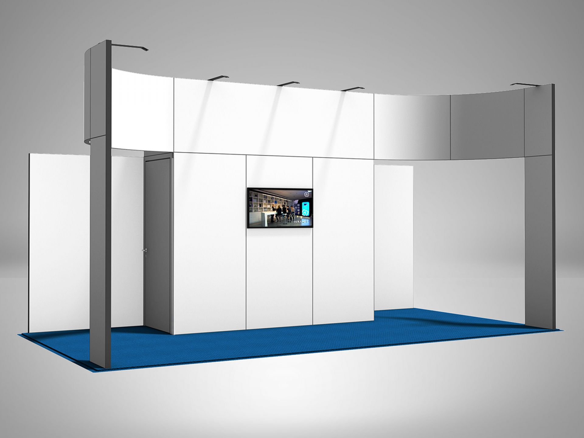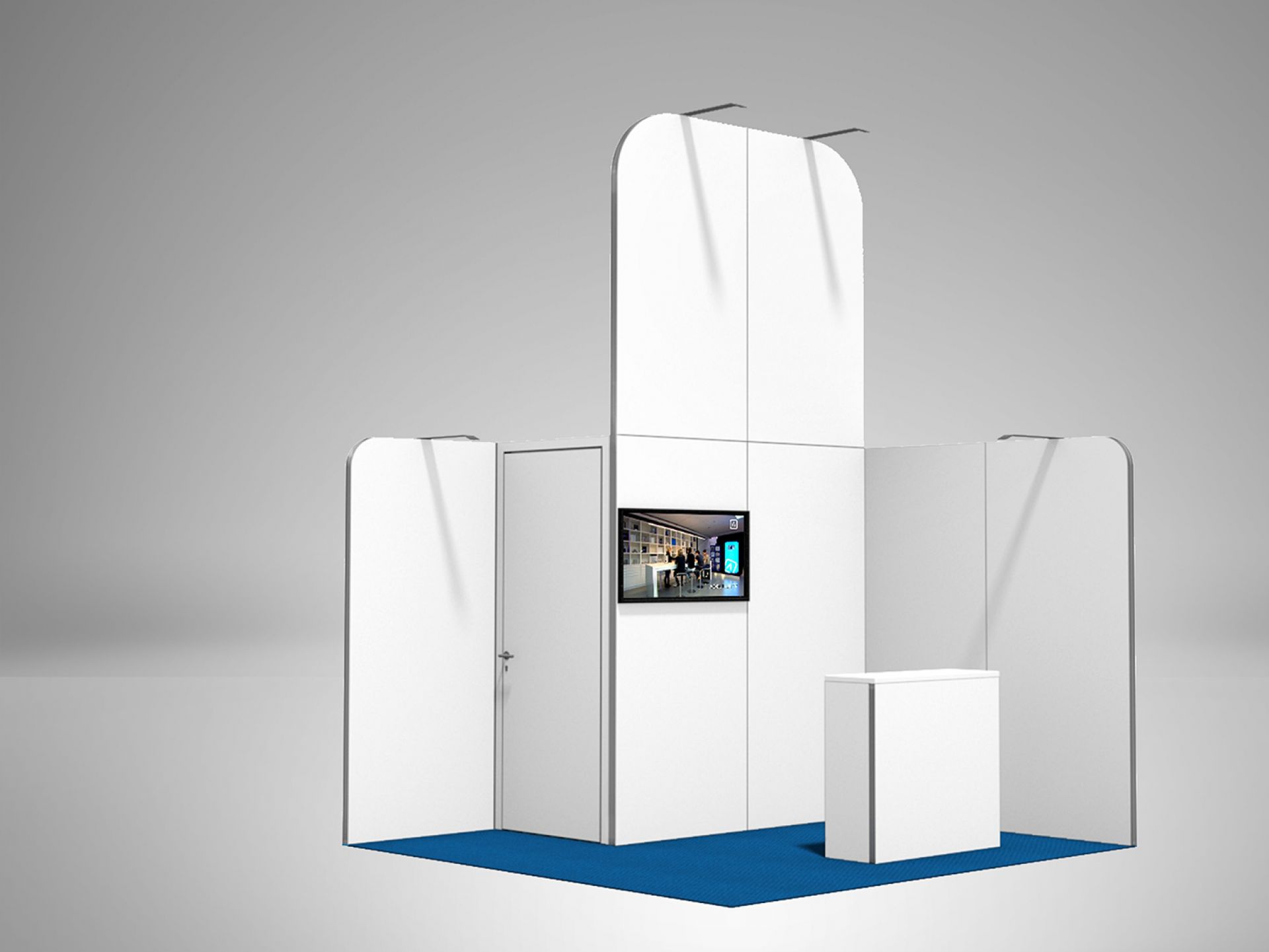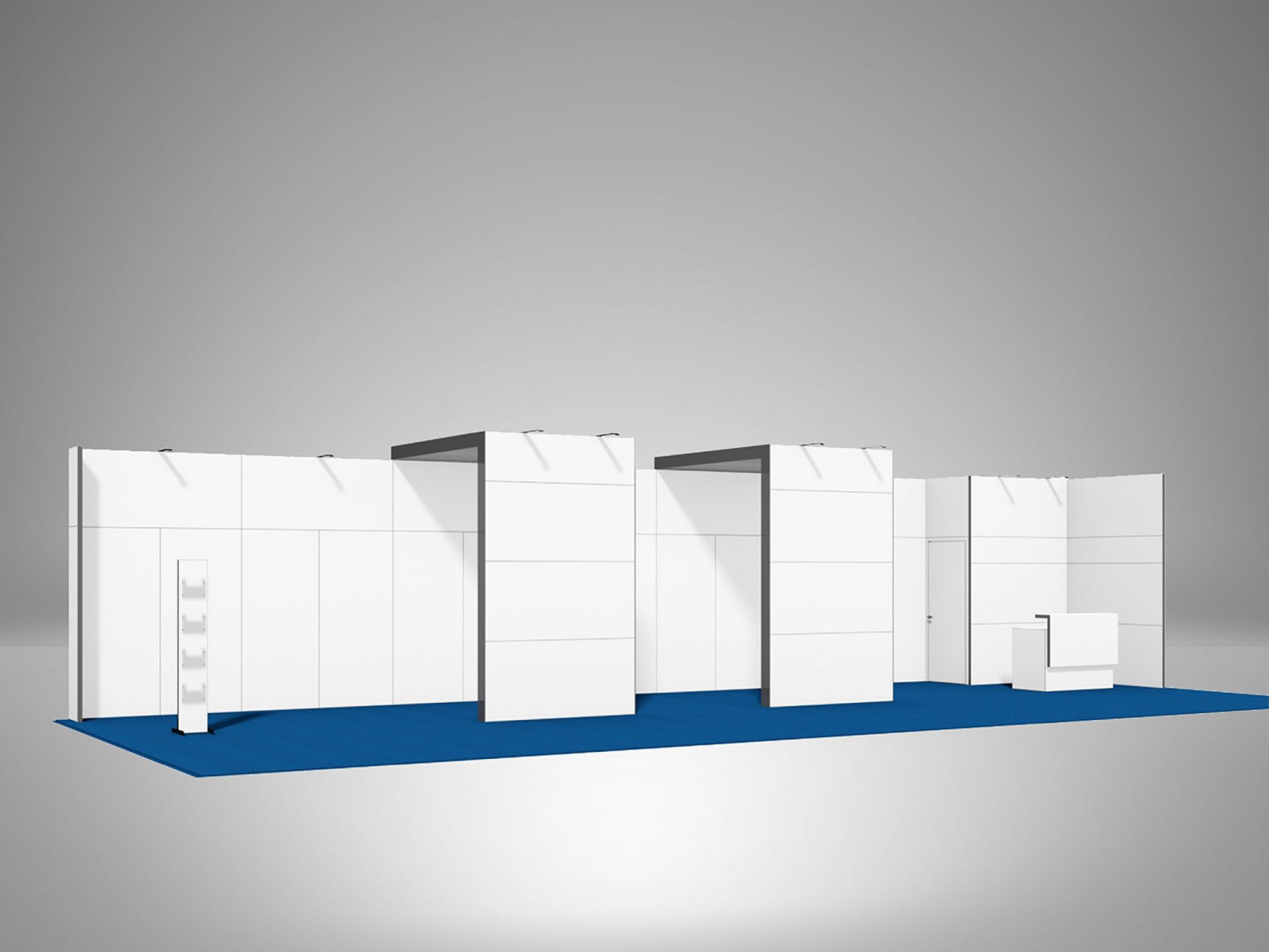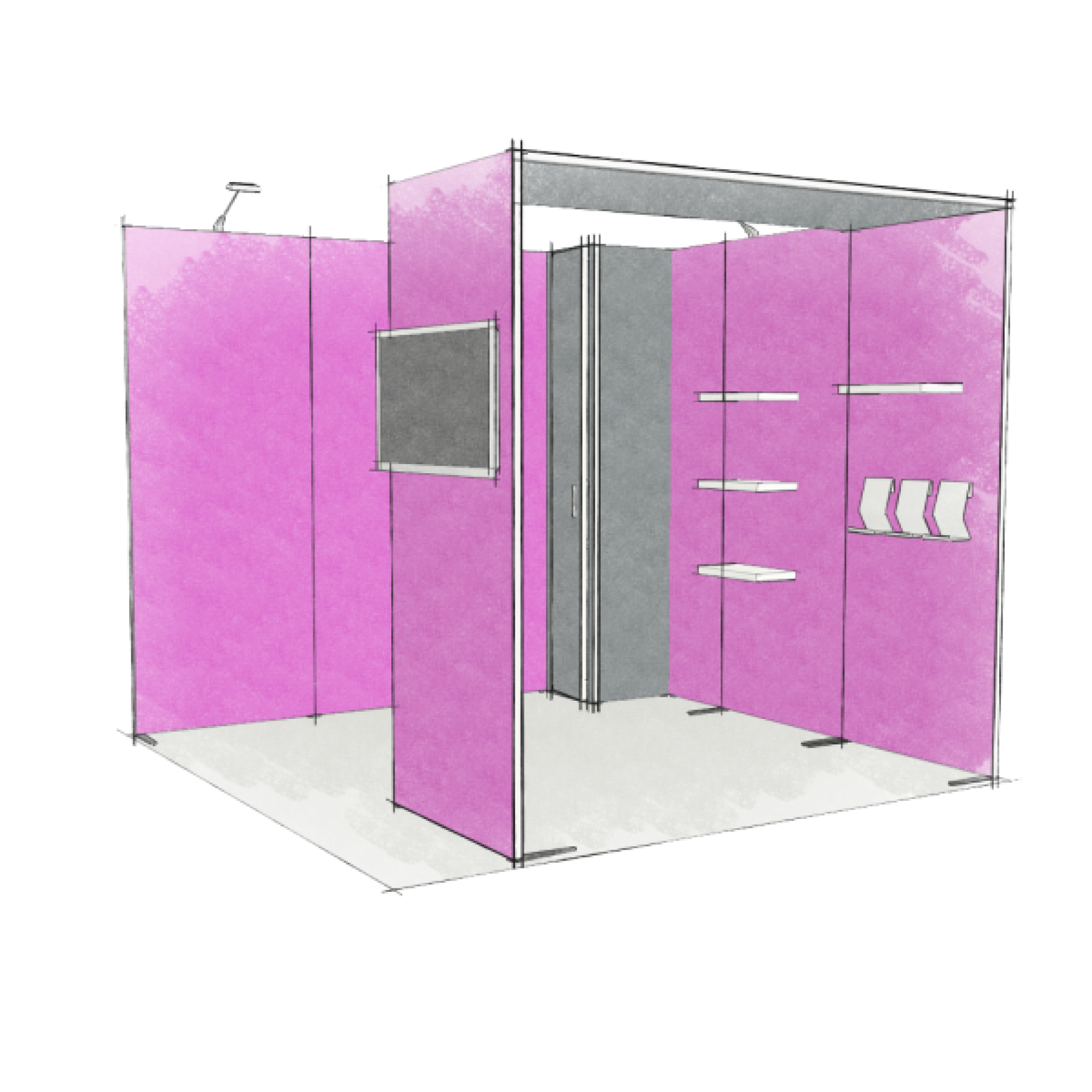 Modulaire et évolutif : les cadres se connectent entre eux et les accessoires optionnels tels que TV, étagères, éclairage transforment les cadres en stands d'exposition.