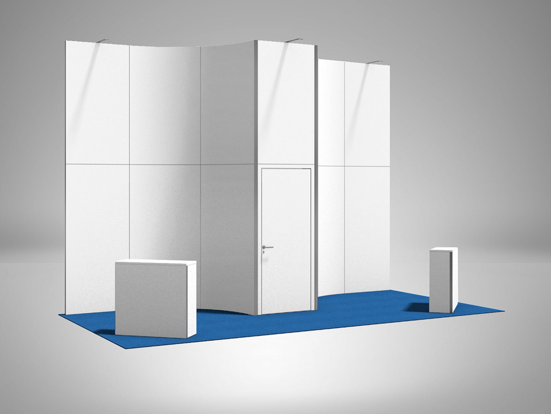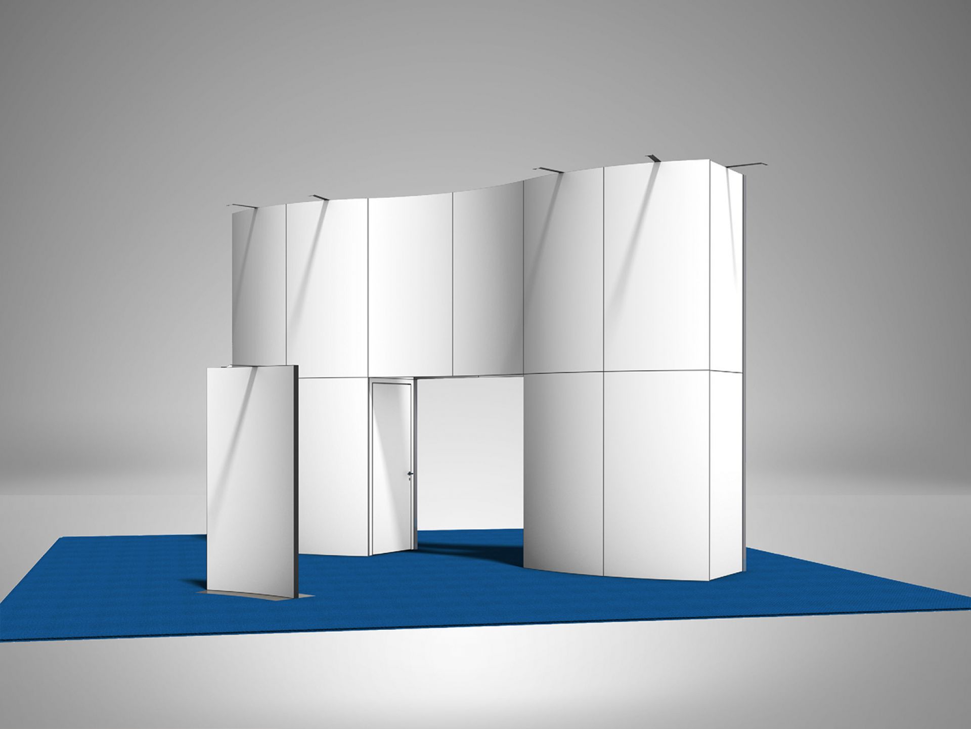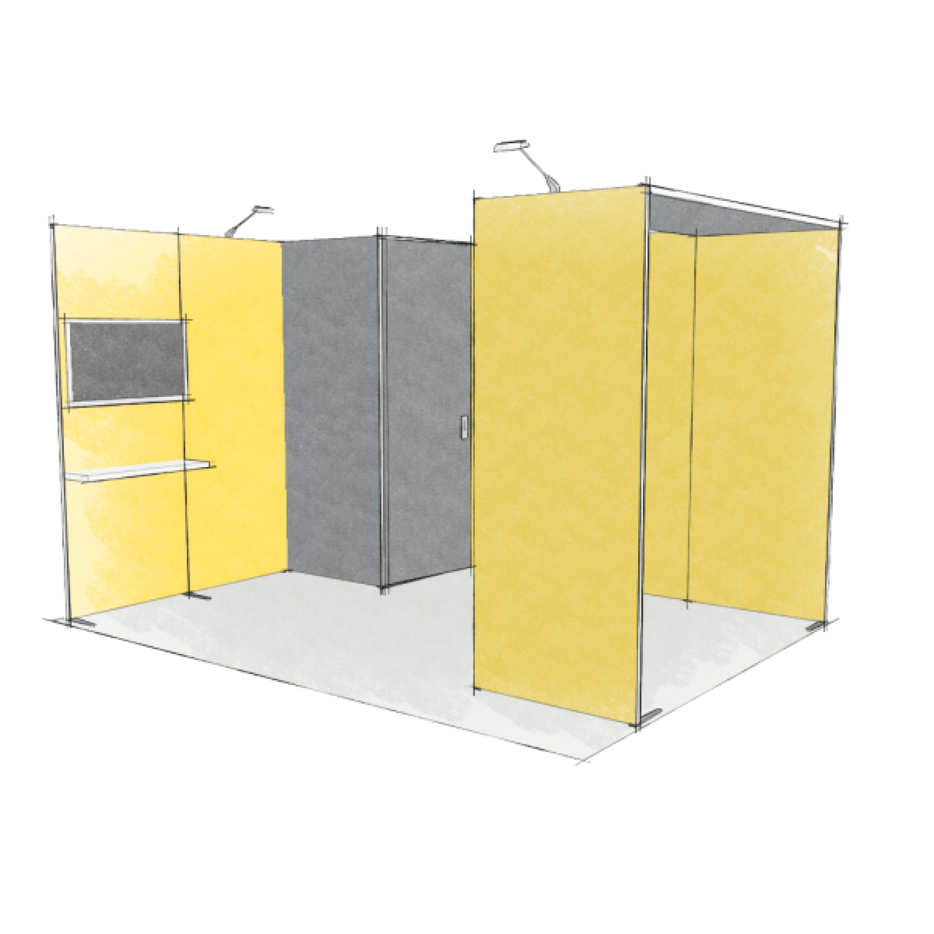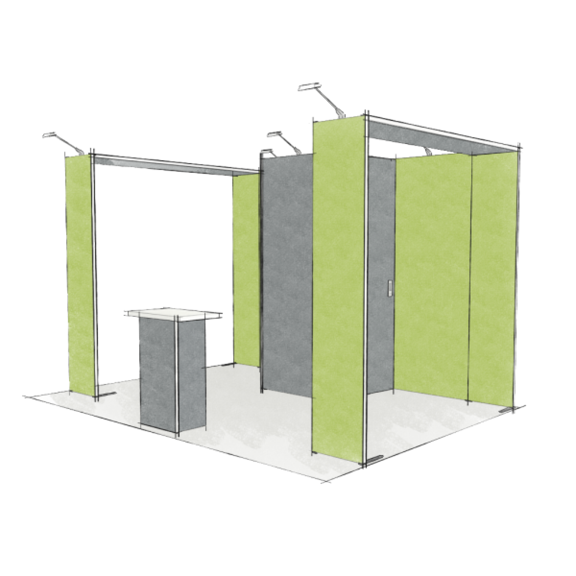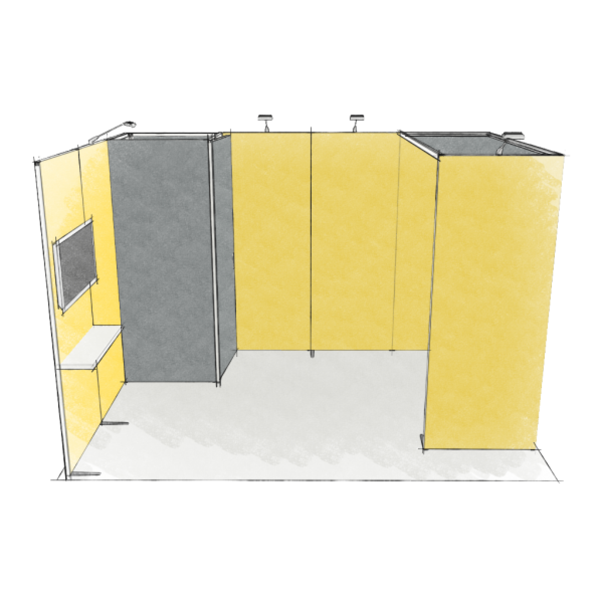 Modulaire et évolutif : les cadres se connectent entre eux et les accessoires optionnels tels que TV, étagères, éclairage transforment les cadres en stands d'exposition.