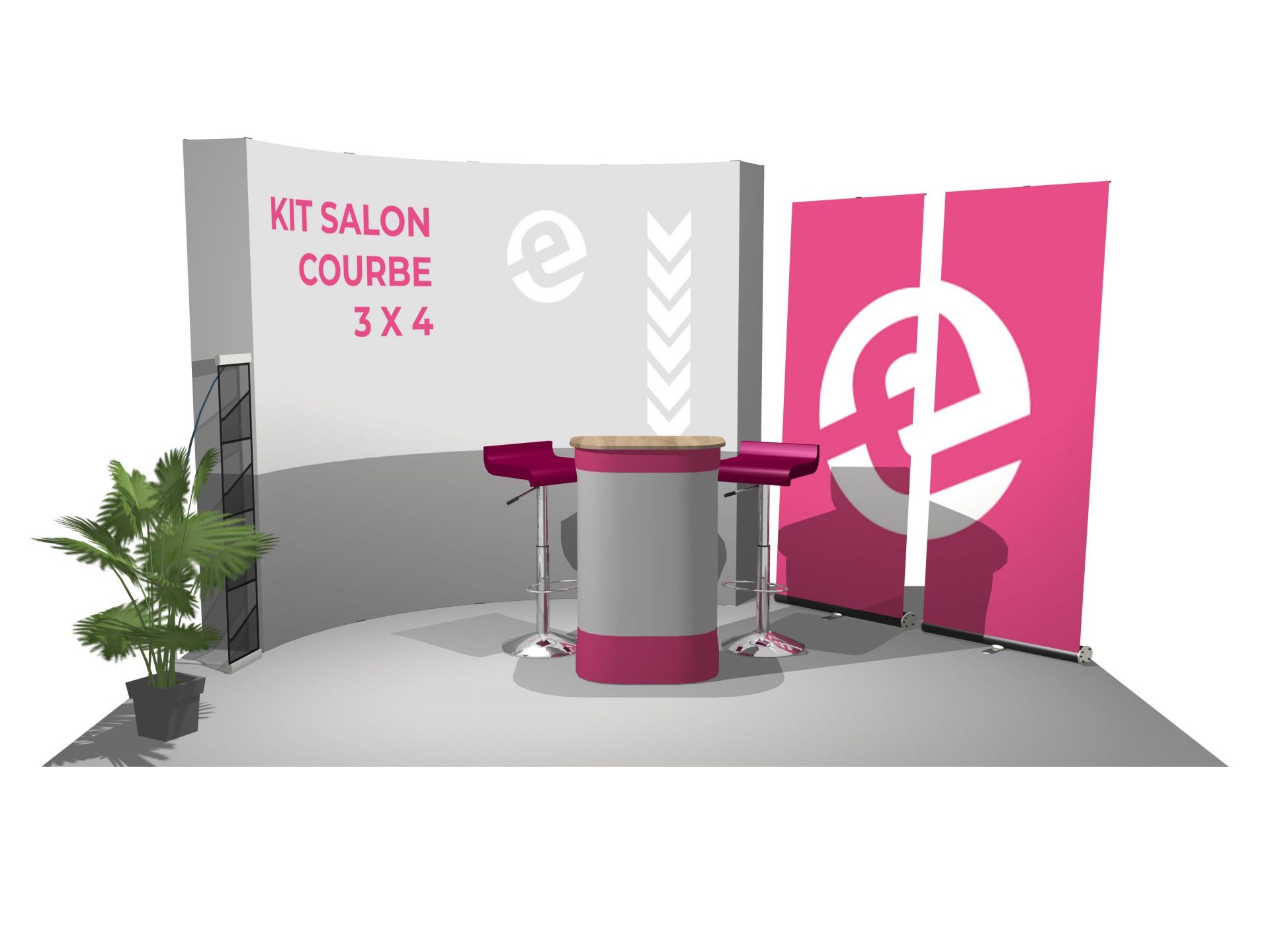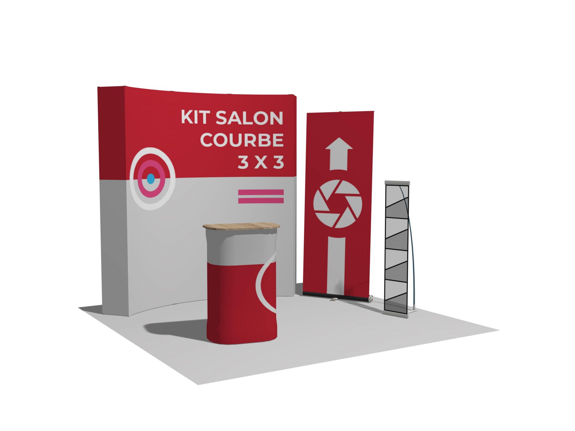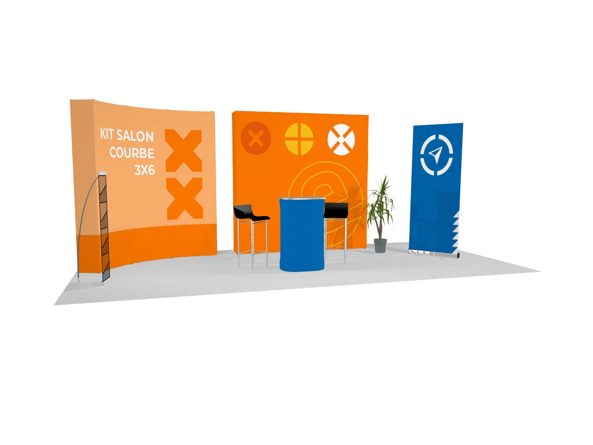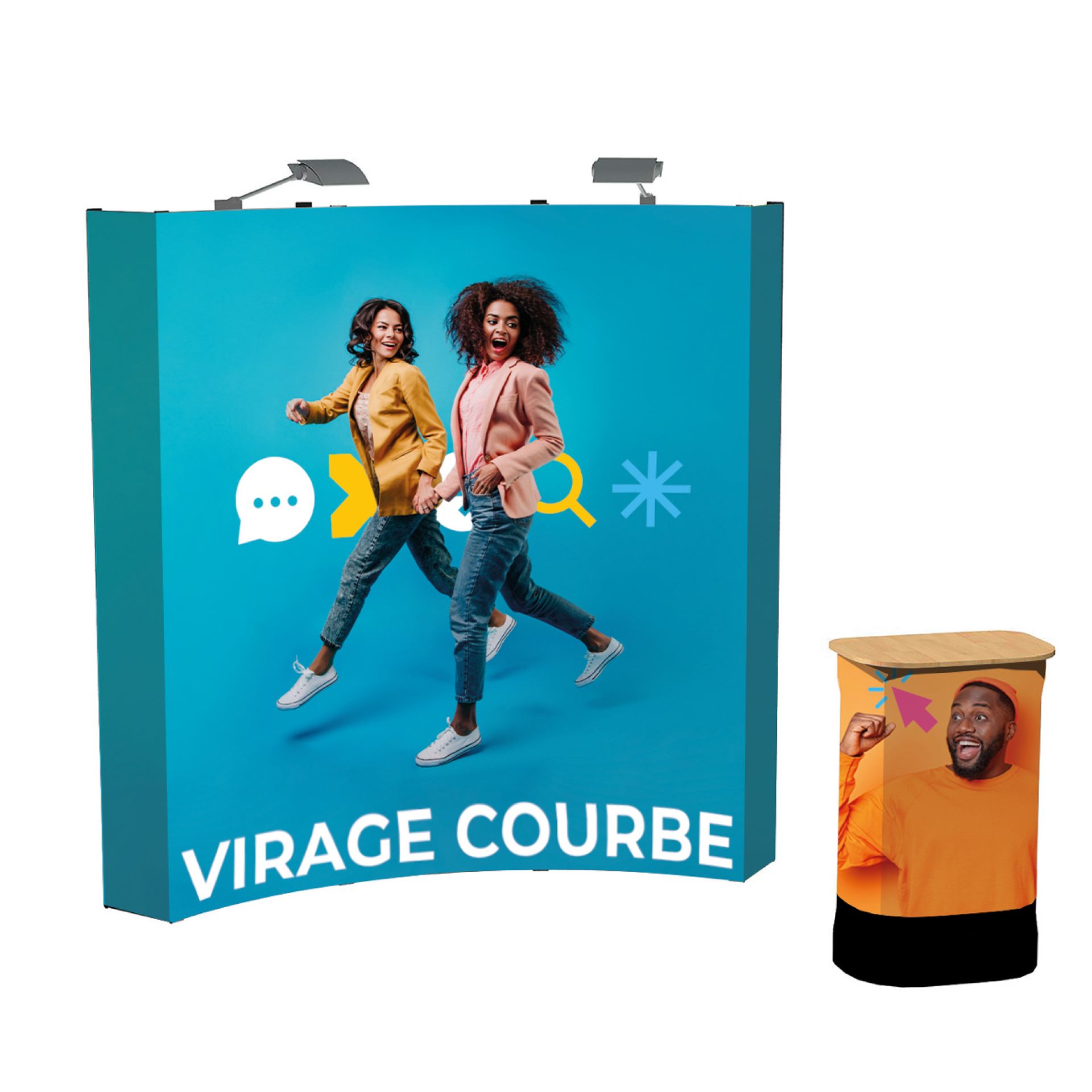 Le Virage est un stand parapluie textile courbe. L'association du stand d'exposition pliable avec un visuel en tissu permet de créer un impact visuel en quelques minutes seulement.