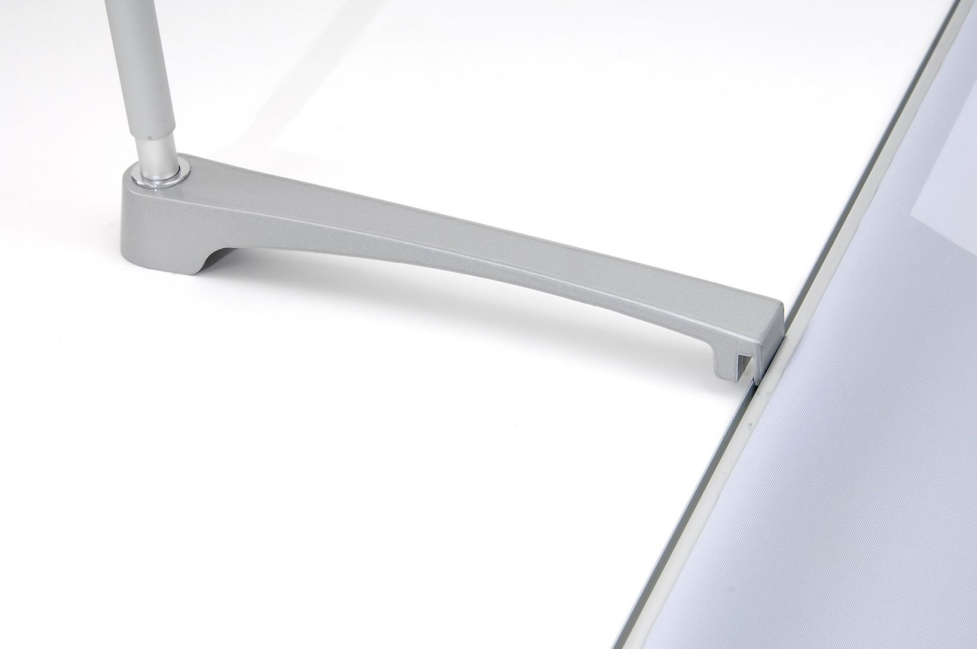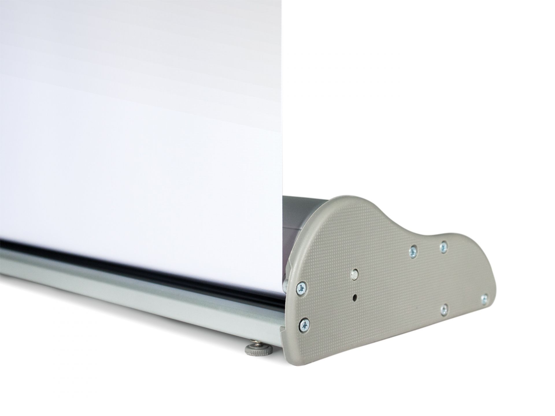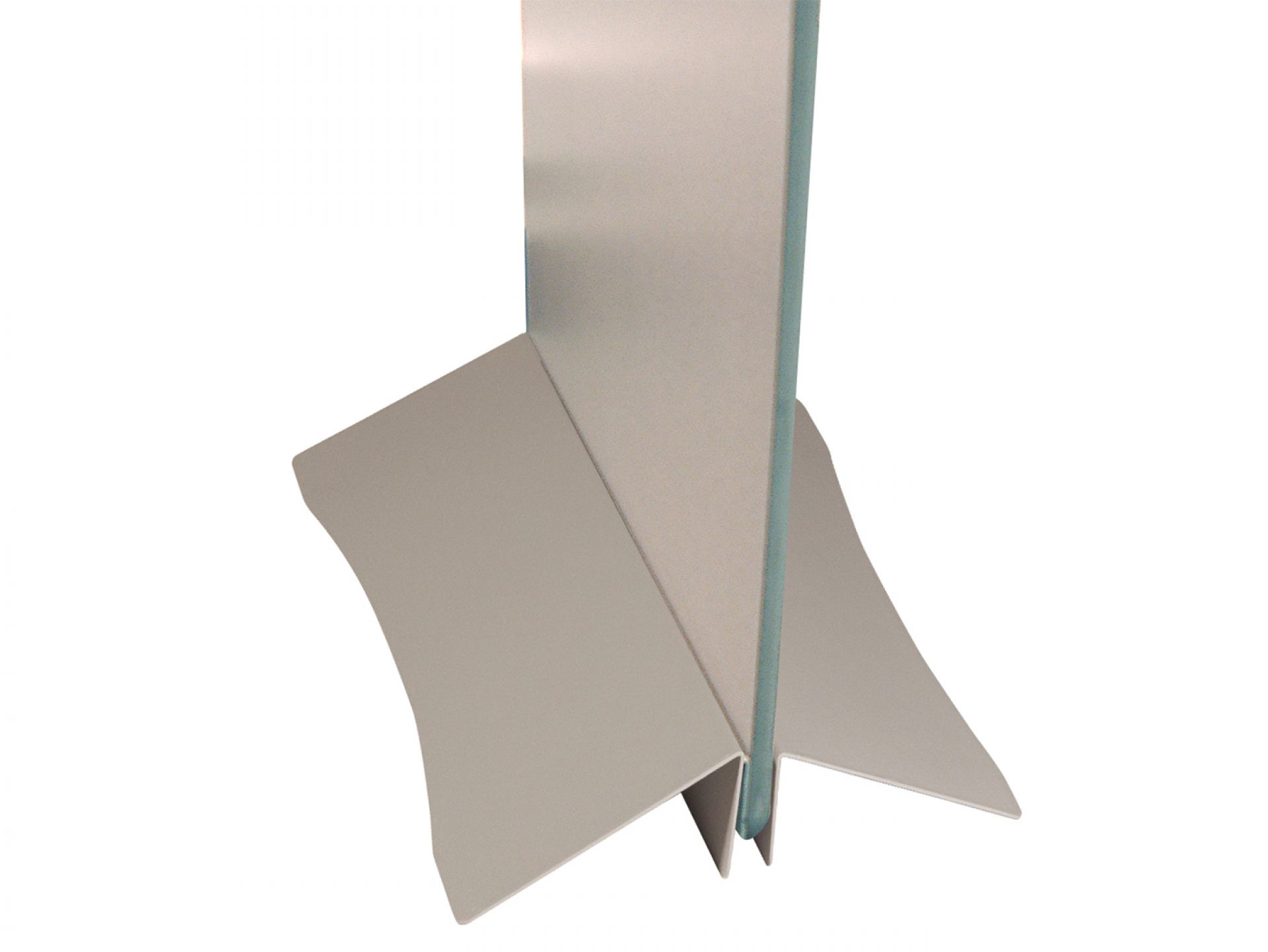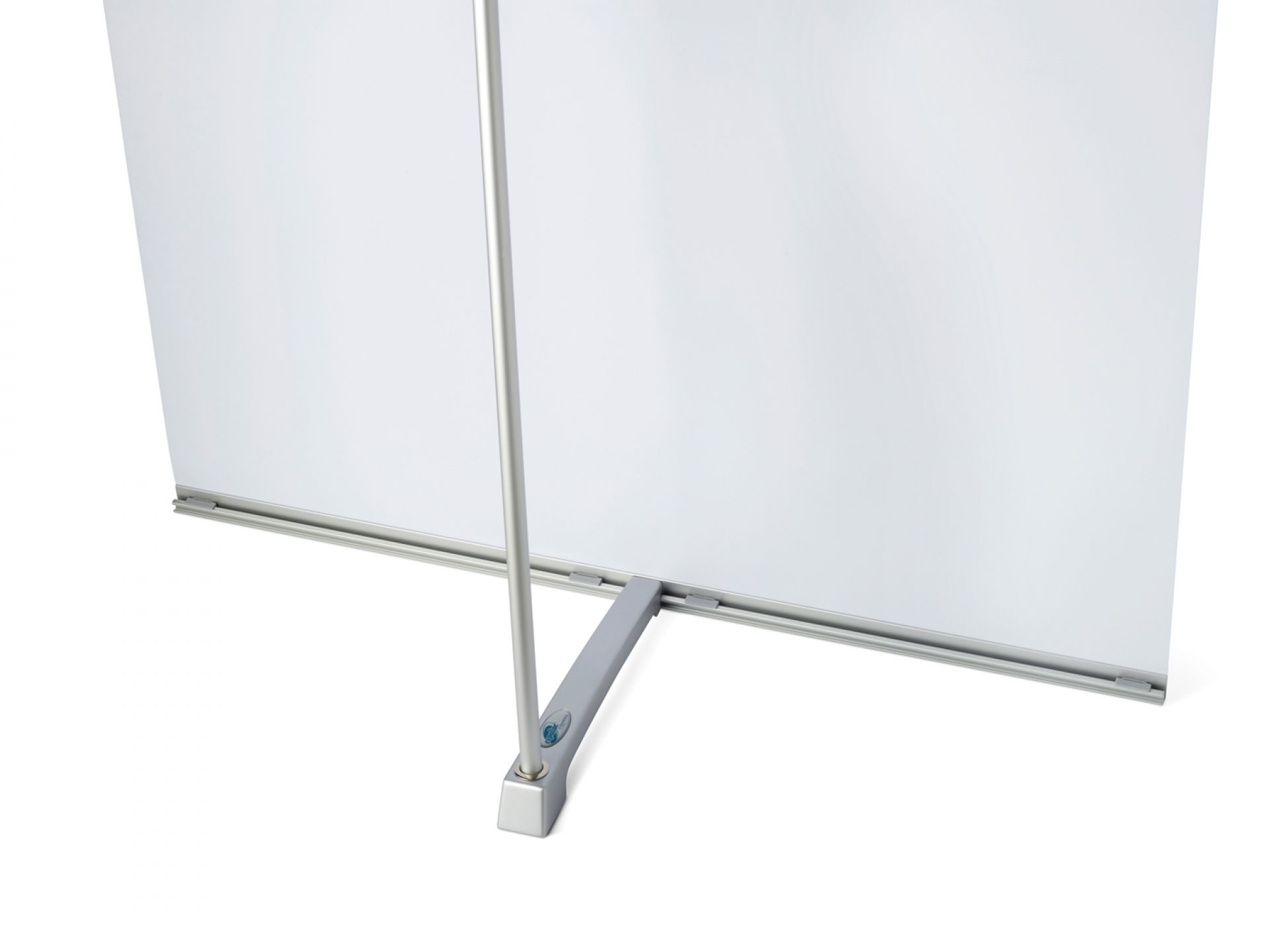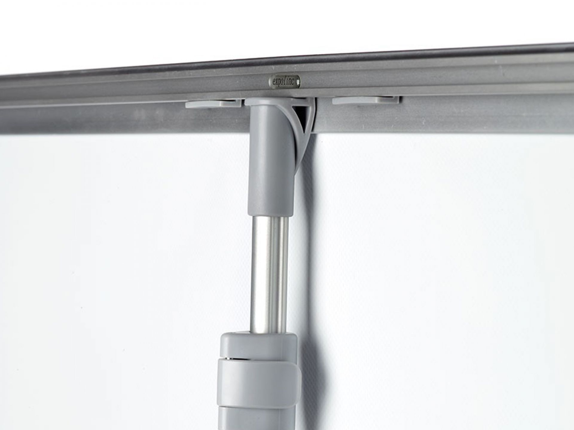 Le panneau de projection double-face Nova est composé d’un cadre incurvé en aluminium argenté, d’un bras de projection en aluminium, d’embouts en plastique gris et de films de couverture transparents en polycarbonate (brillant/mat).