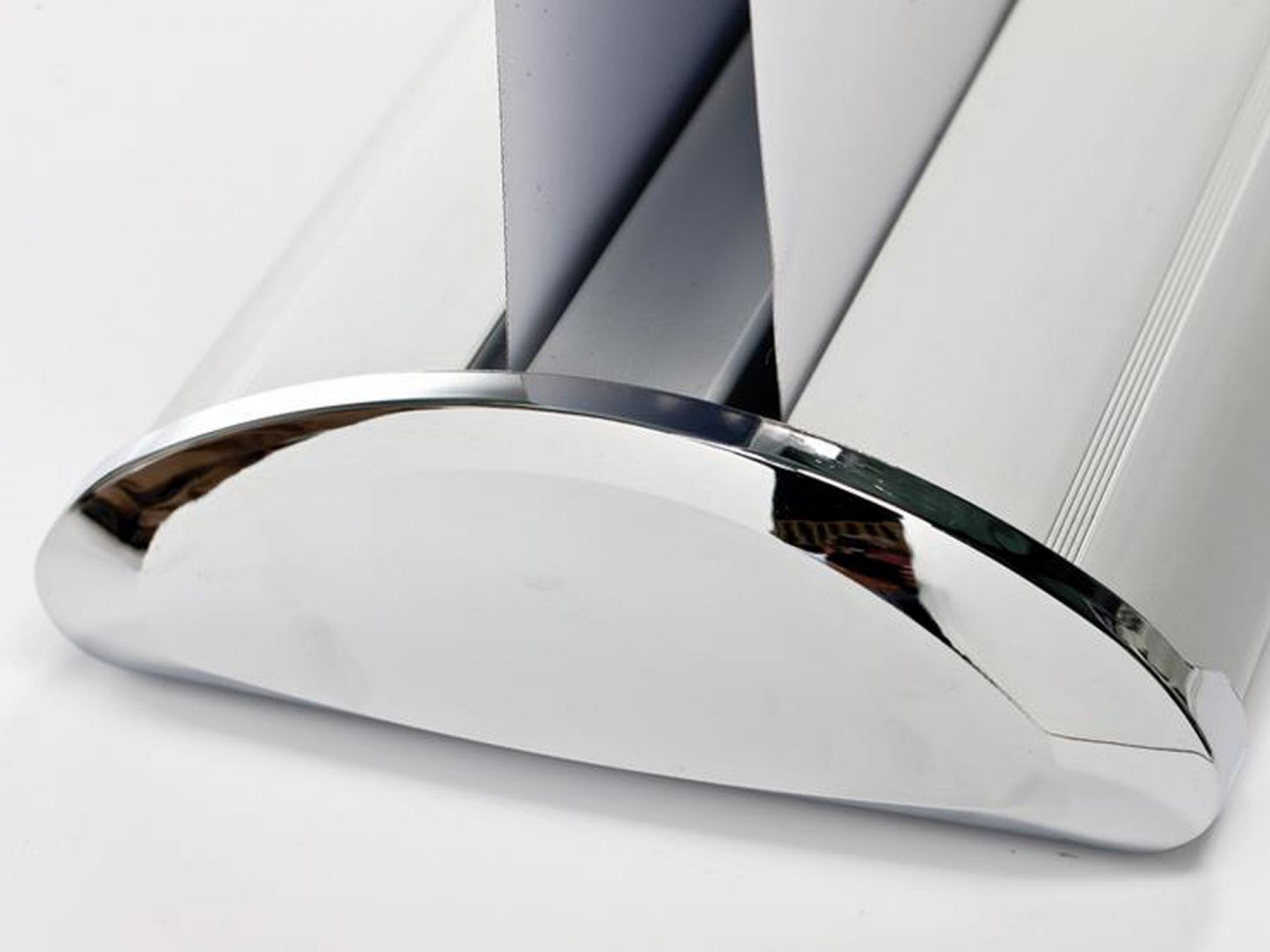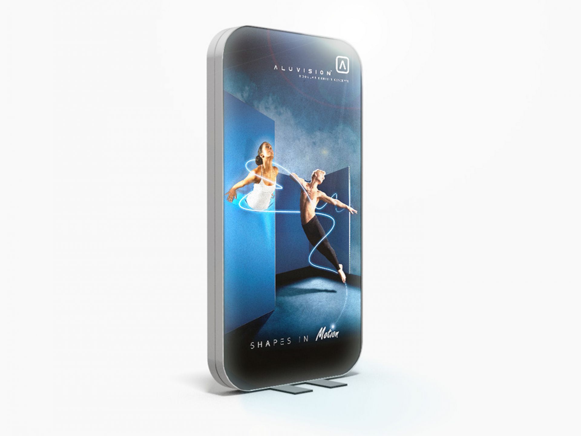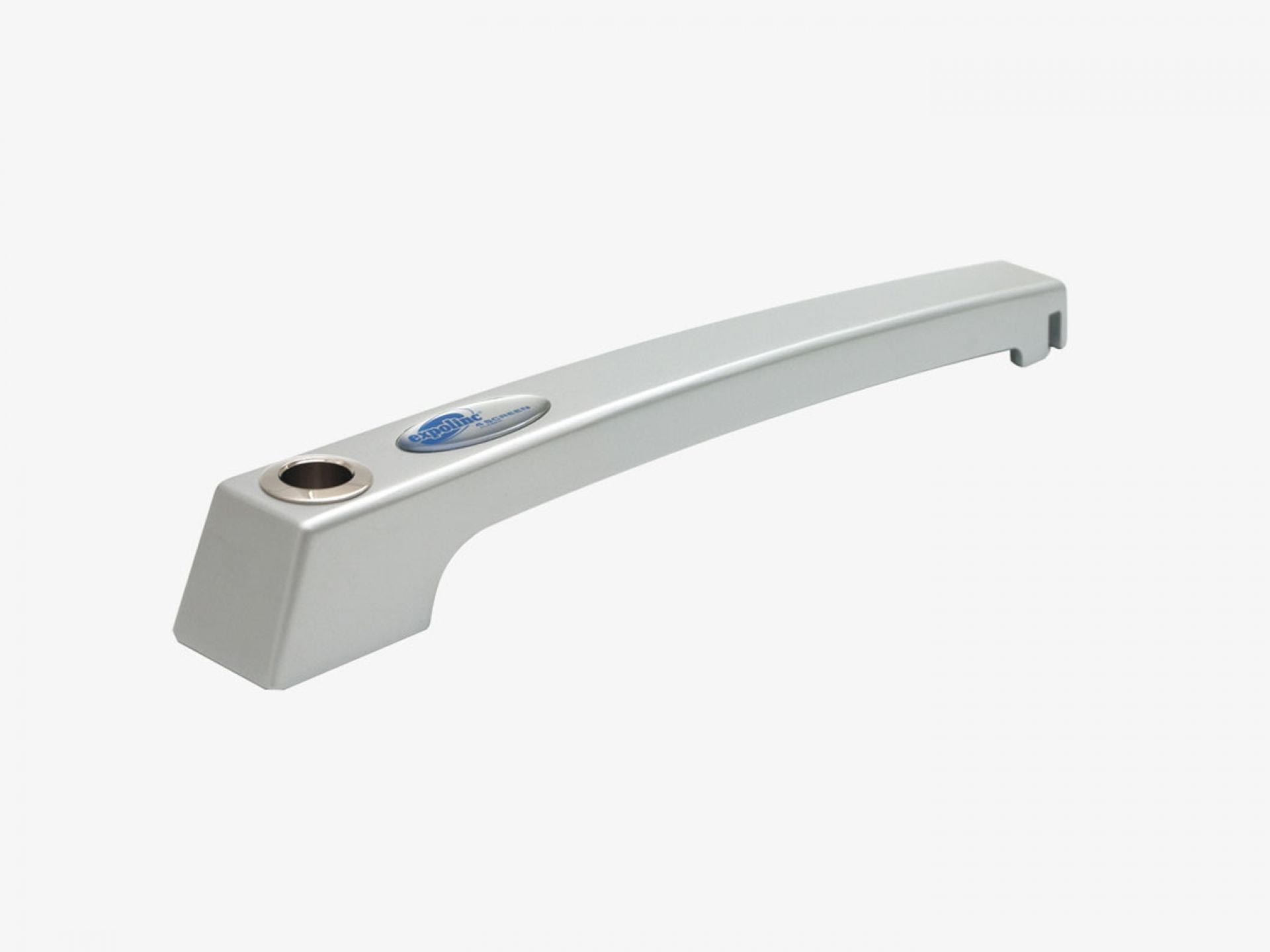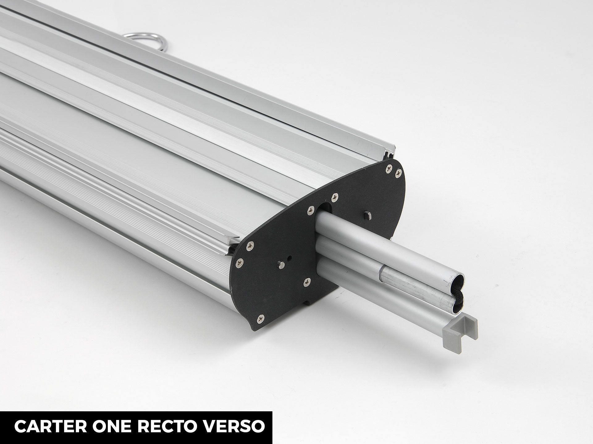 Le panneau de projection double-face Nova est composé d’un cadre incurvé en aluminium argenté, d’un bras de projection en aluminium, d’embouts en plastique gris et de films de couverture transparents en polycarbonate (brillant/mat).