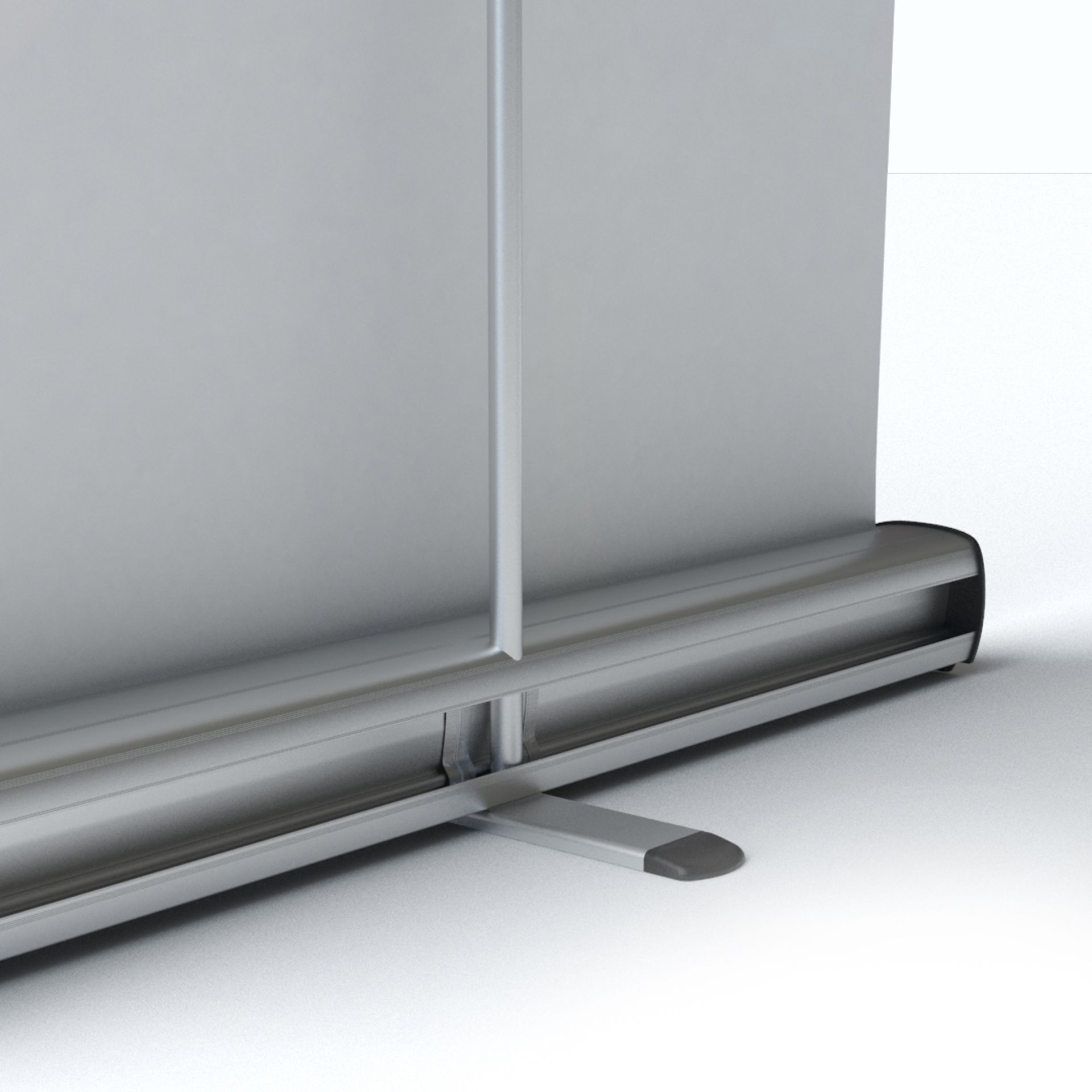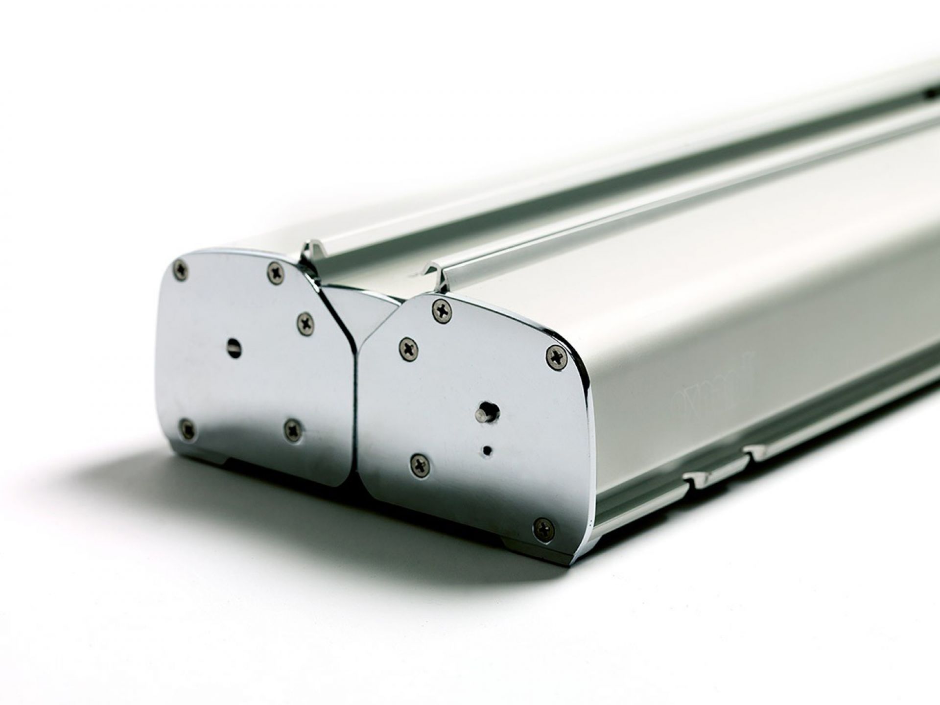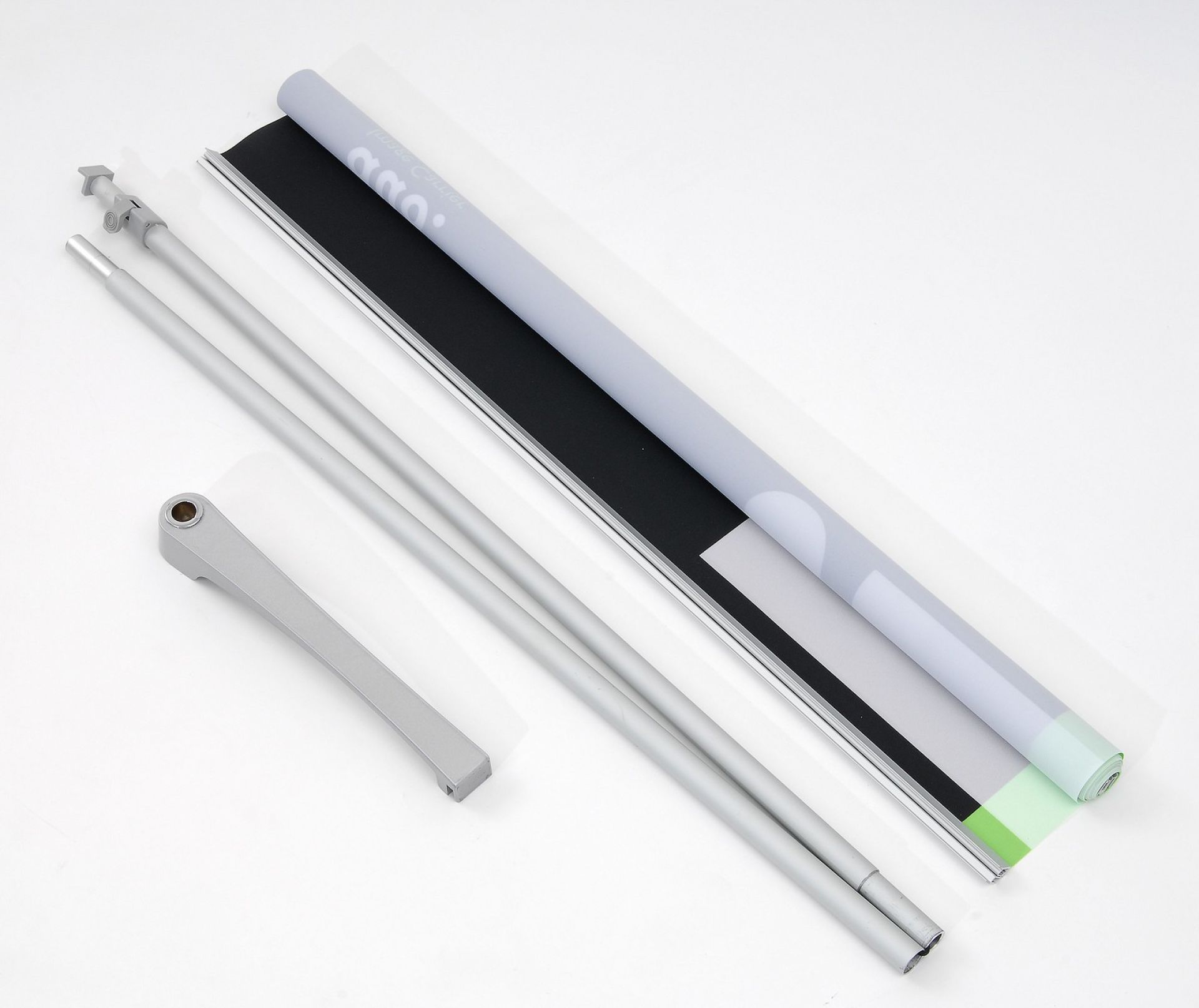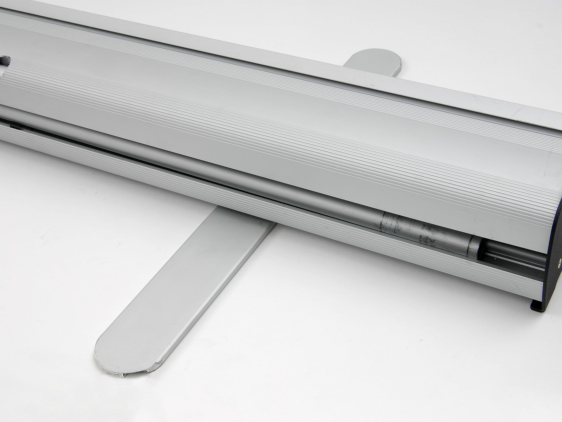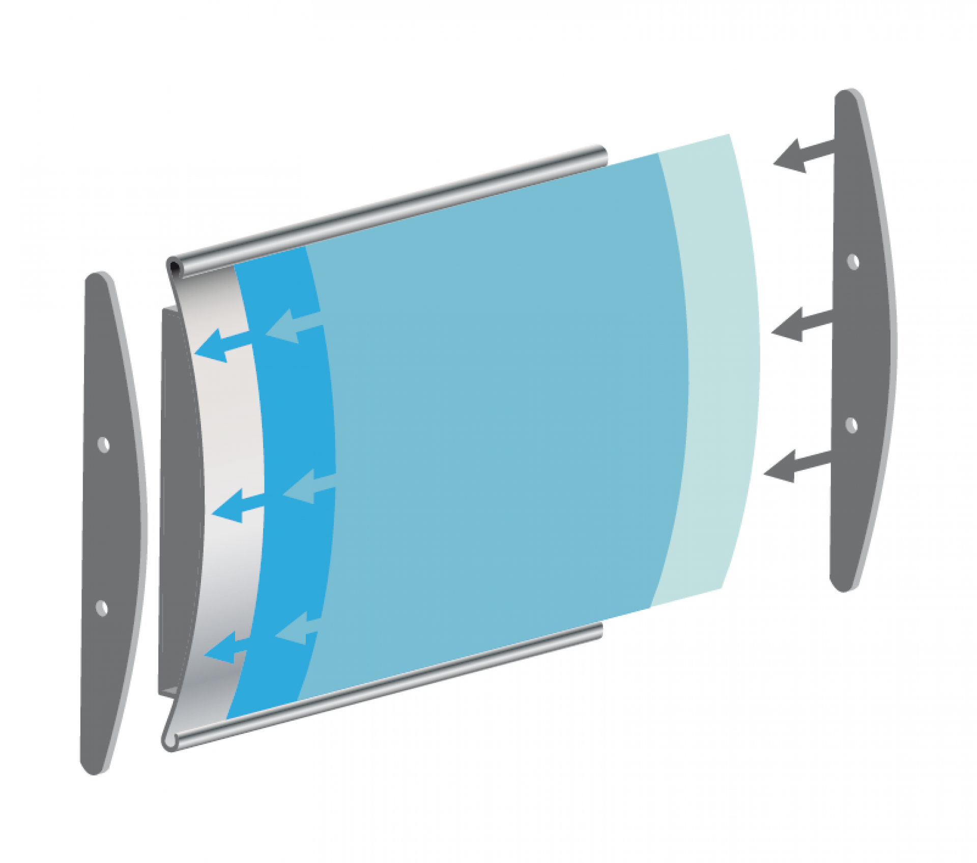 Le panneau de projection double-face Nova est composé d’un cadre incurvé en aluminium argenté, d’un bras de projection en aluminium, d’embouts en plastique gris et de films de couverture transparents en polycarbonate (brillant/mat).