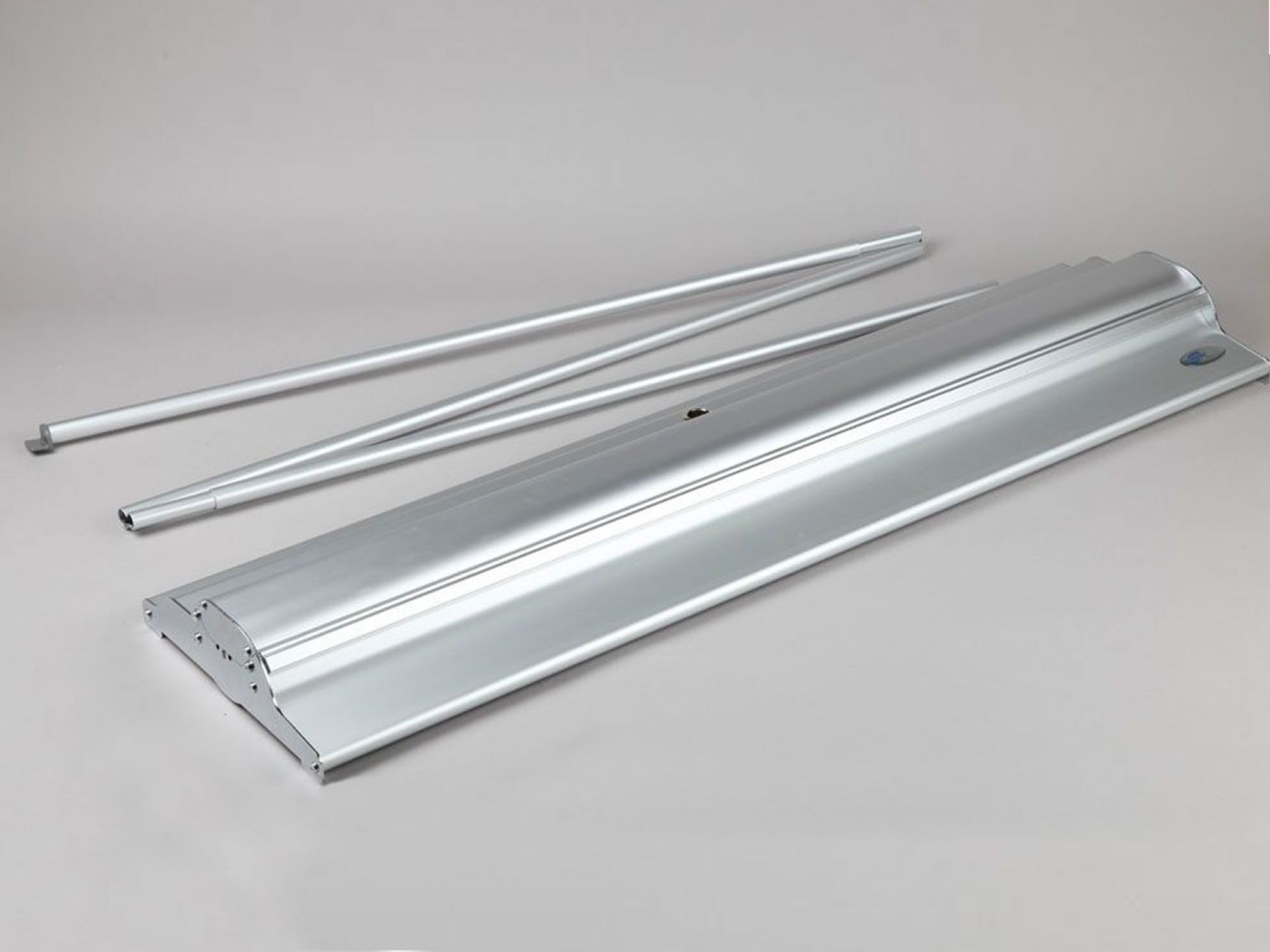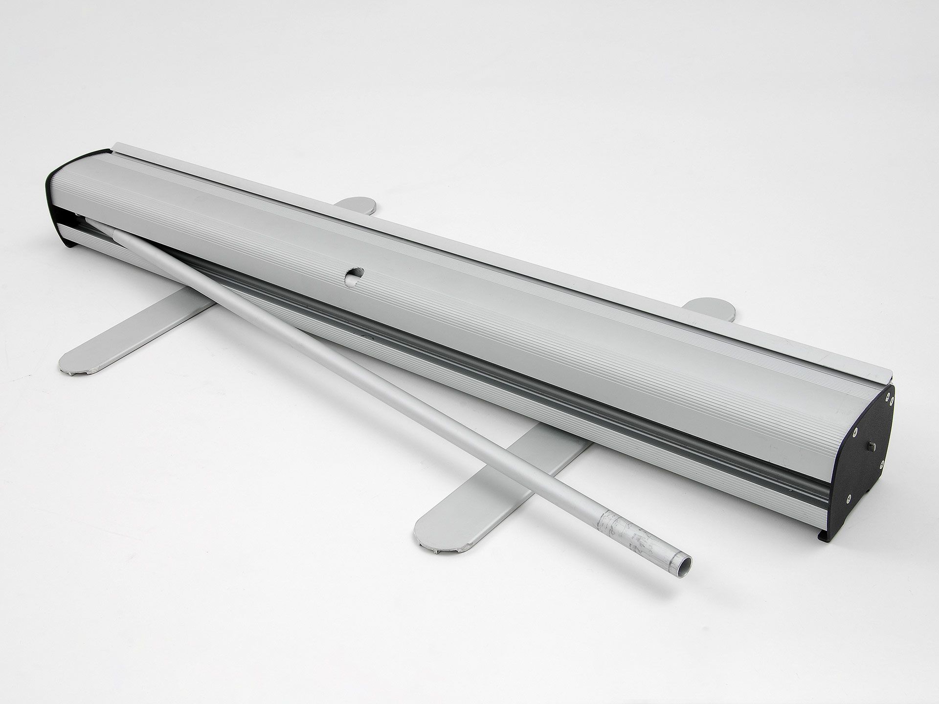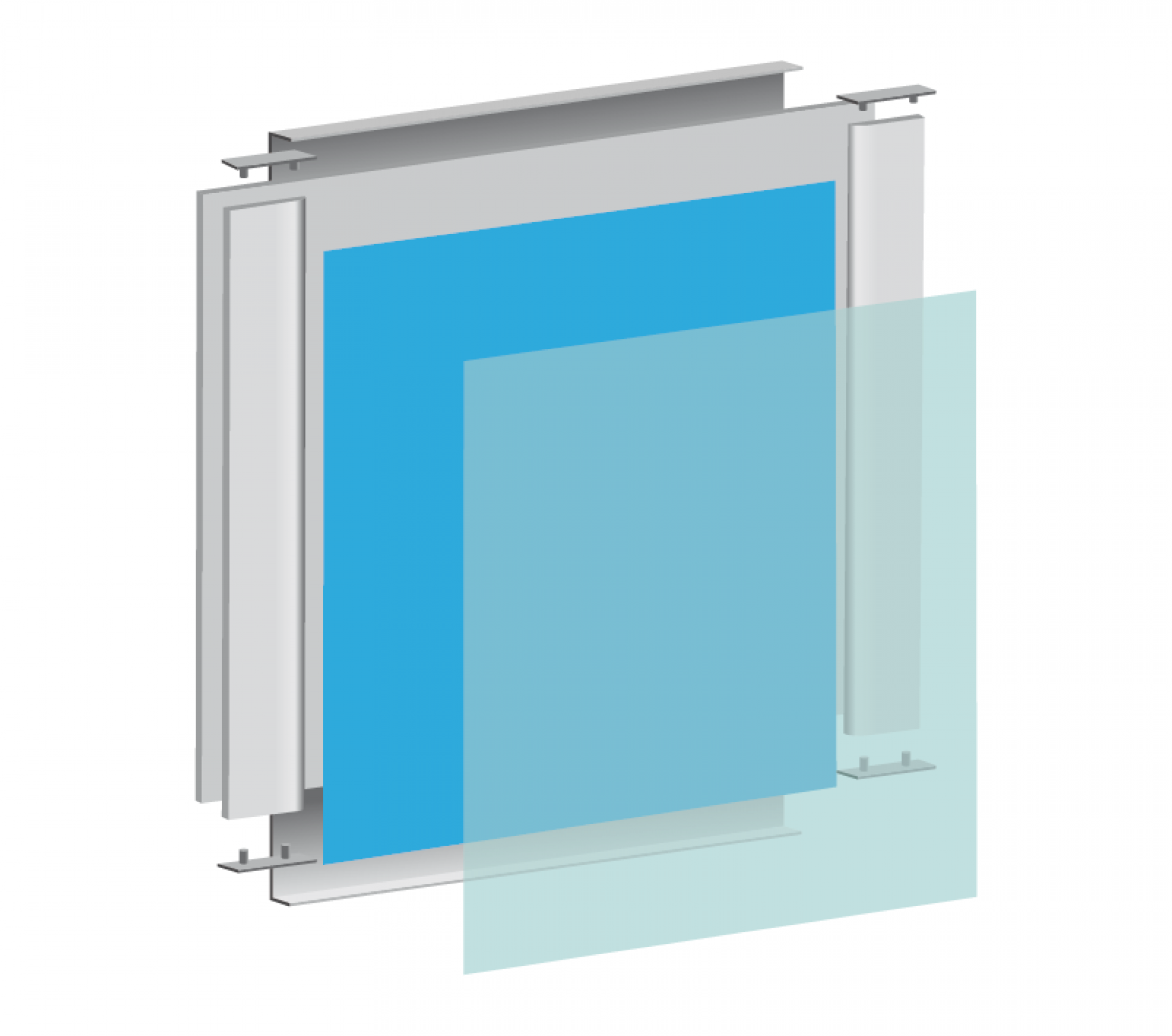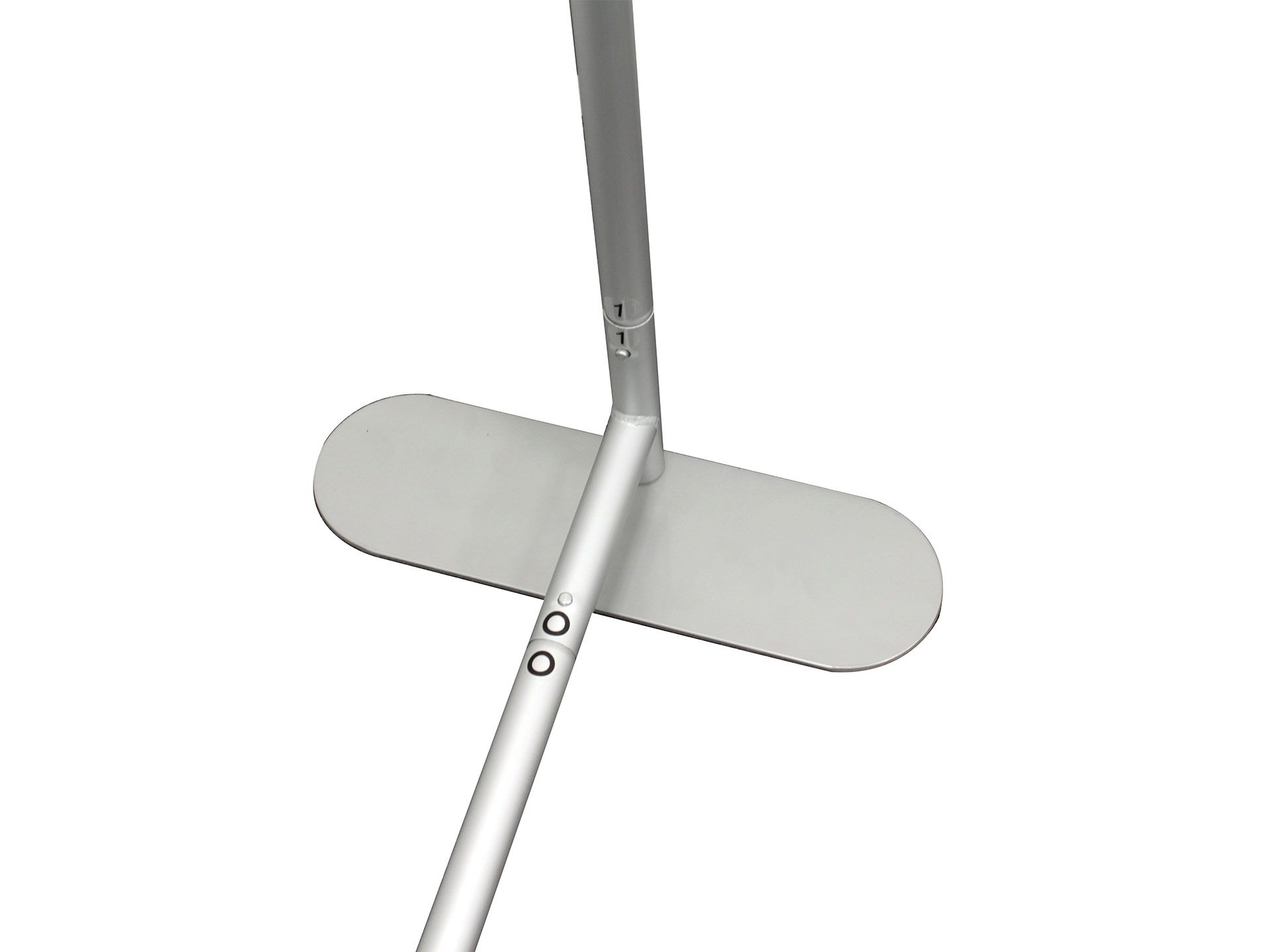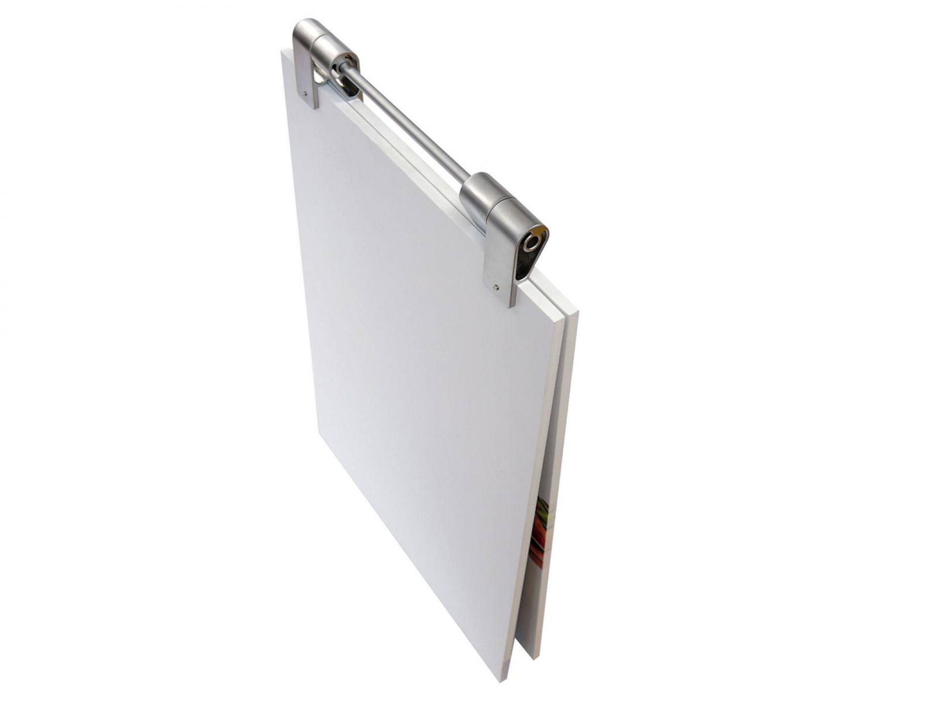 Le panneau de projection double-face Nova est composé d’un cadre incurvé en aluminium argenté, d’un bras de projection en aluminium, d’embouts en plastique gris et de films de couverture transparents en polycarbonate (brillant/mat).