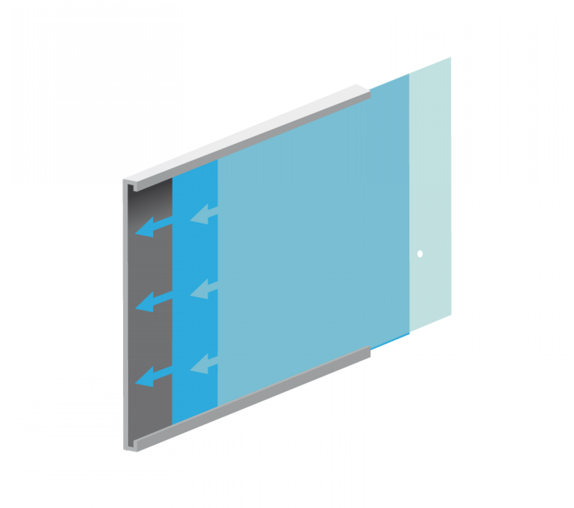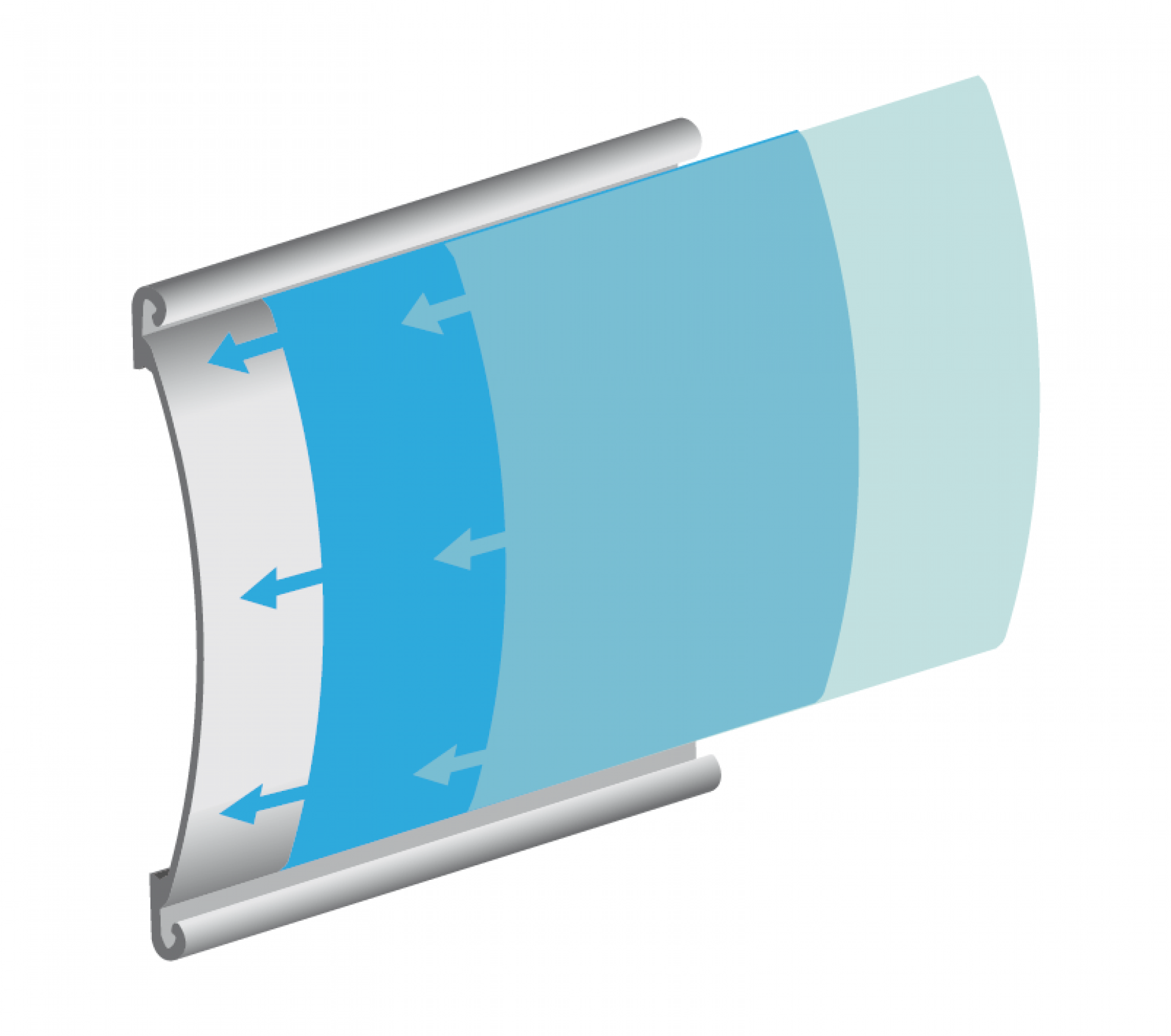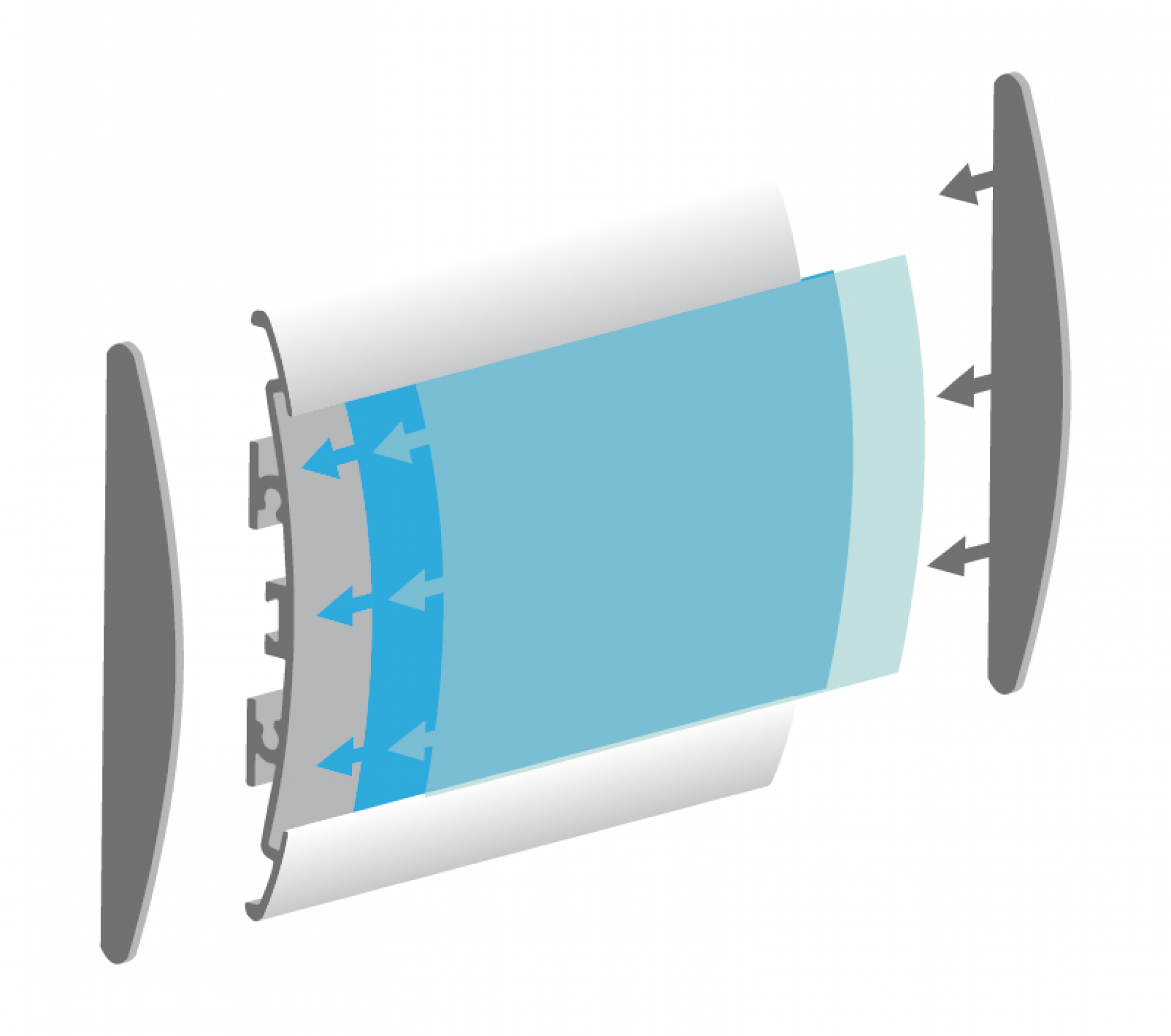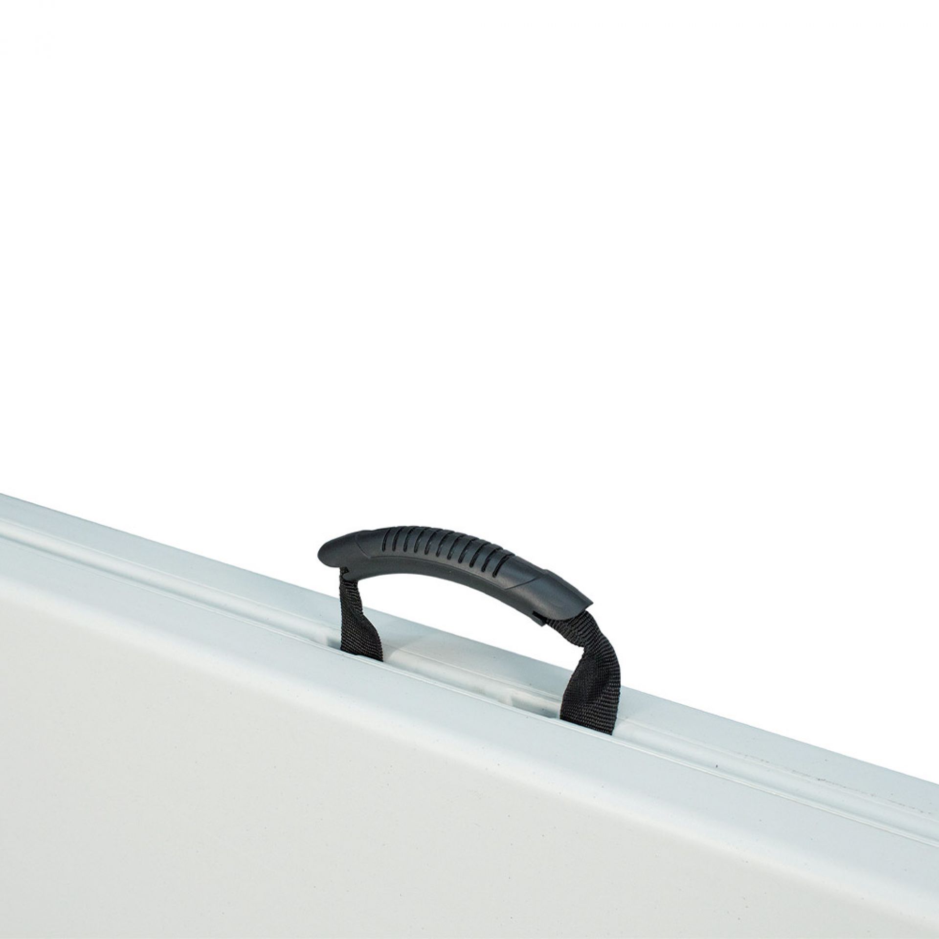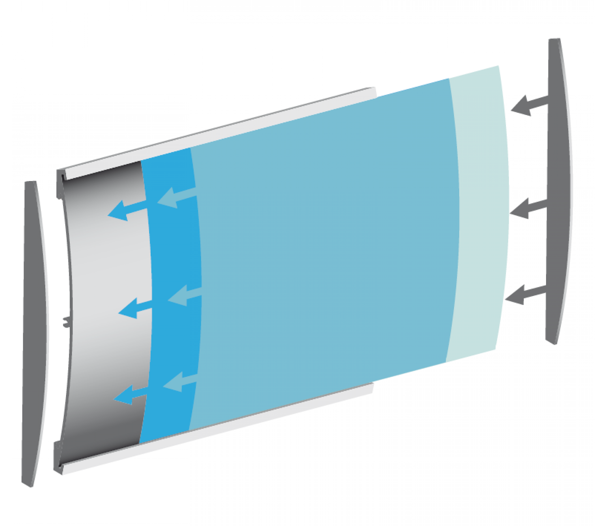 Le panneau de projection double-face Nova est composé d’un cadre incurvé en aluminium argenté, d’un bras de projection en aluminium, d’embouts en plastique gris et de films de couverture transparents en polycarbonate (brillant/mat).