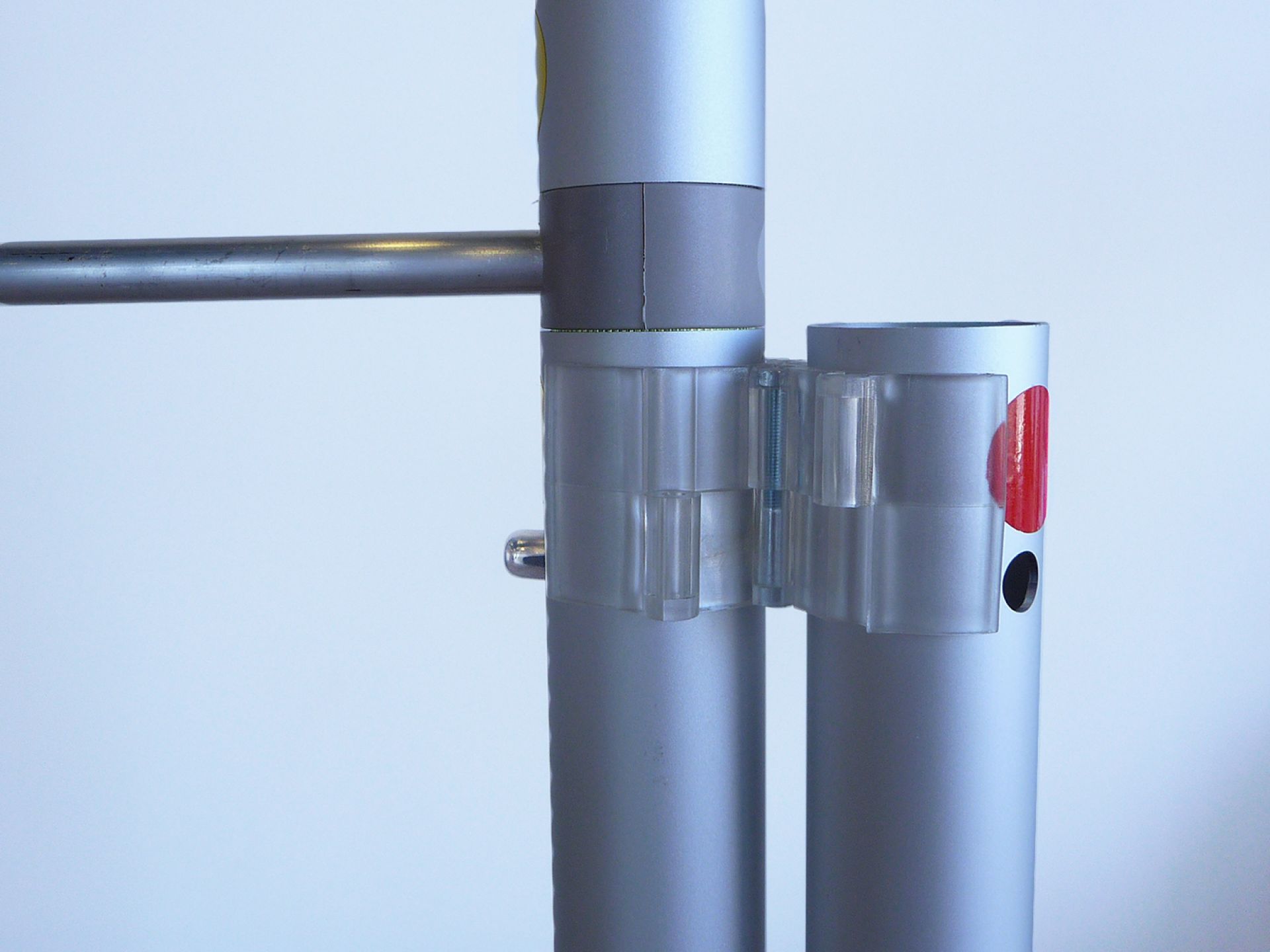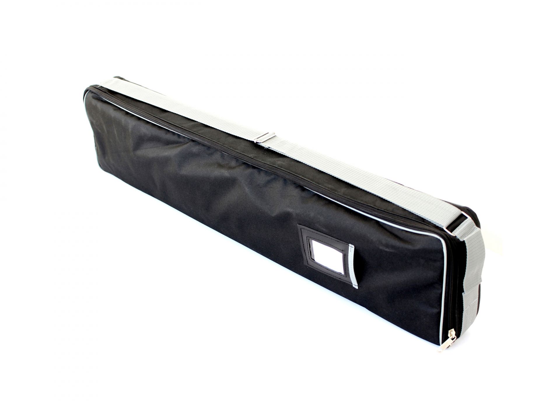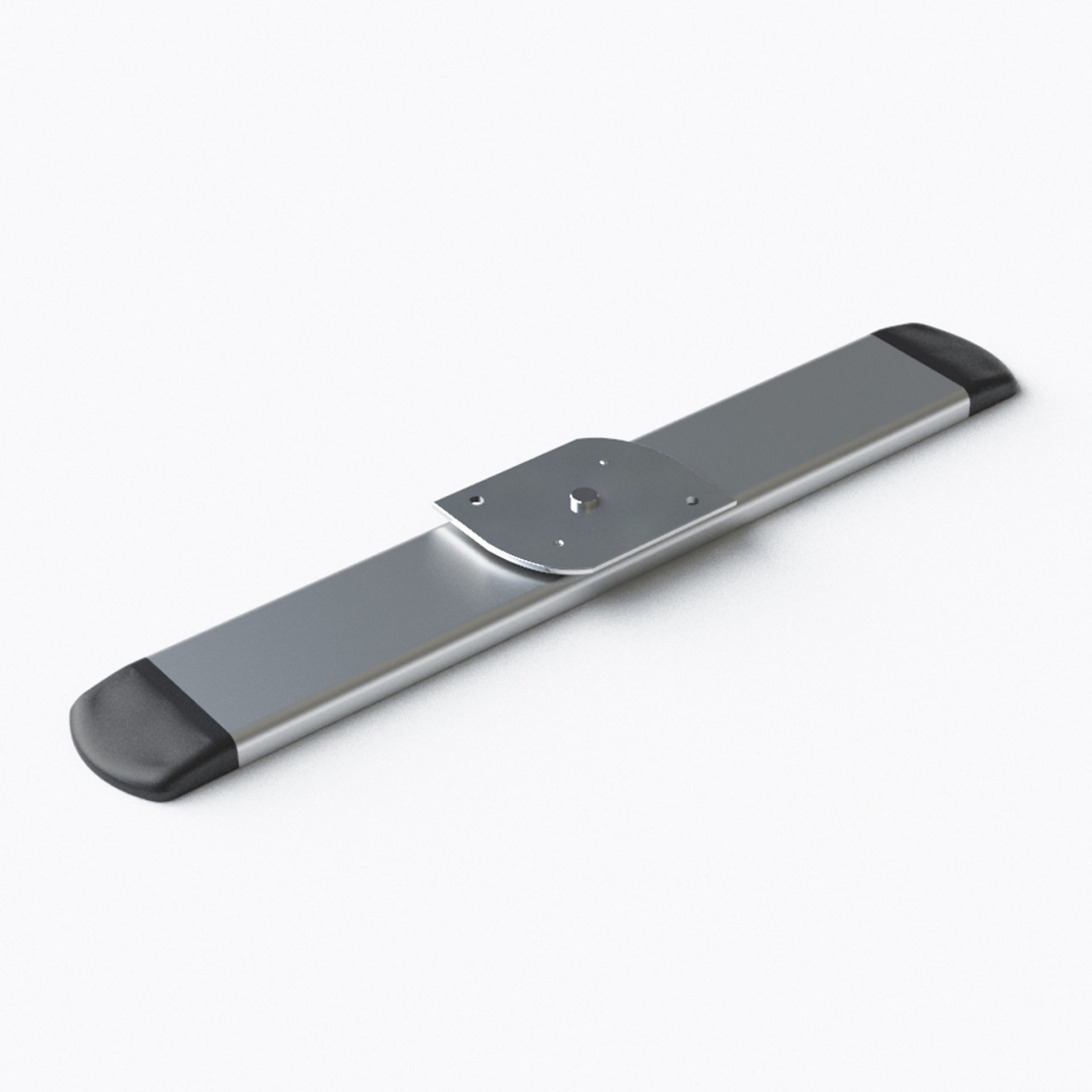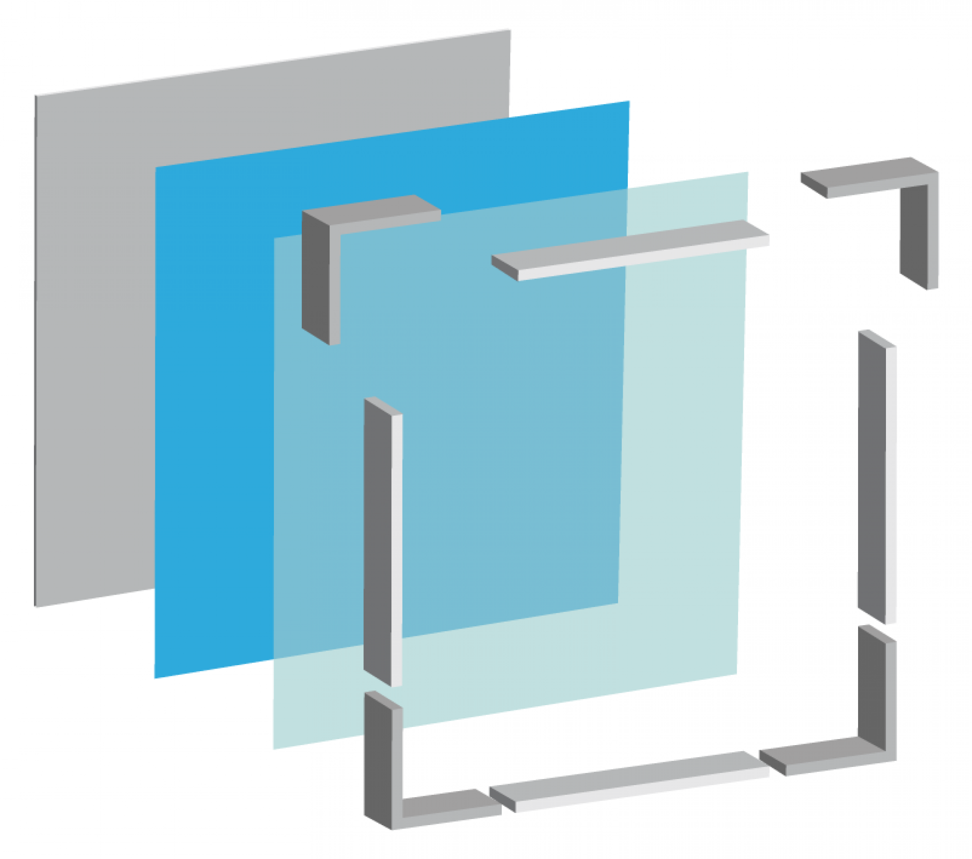 Le panneau de projection double-face Nova est composé d’un cadre incurvé en aluminium argenté, d’un bras de projection en aluminium, d’embouts en plastique gris et de films de couverture transparents en polycarbonate (brillant/mat).