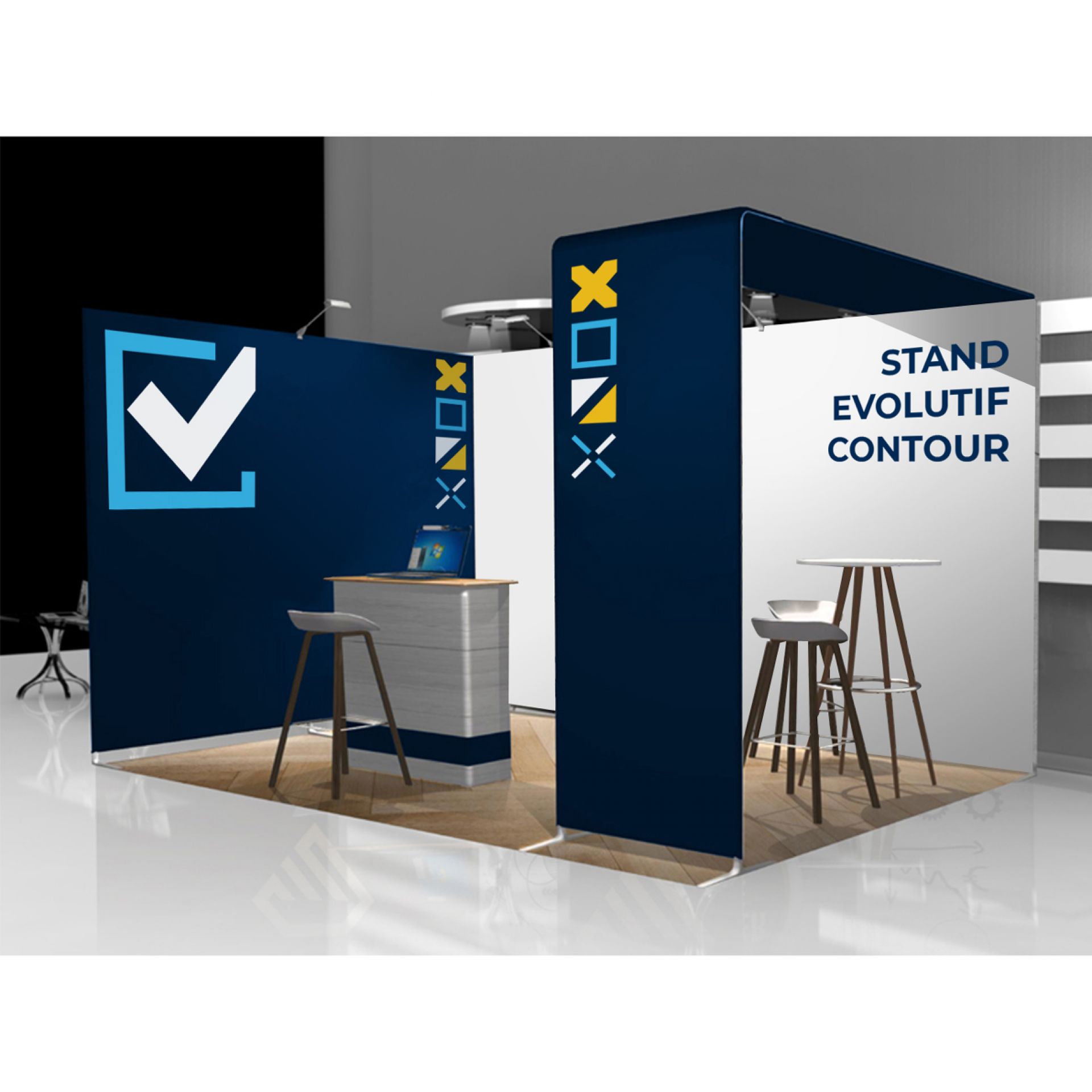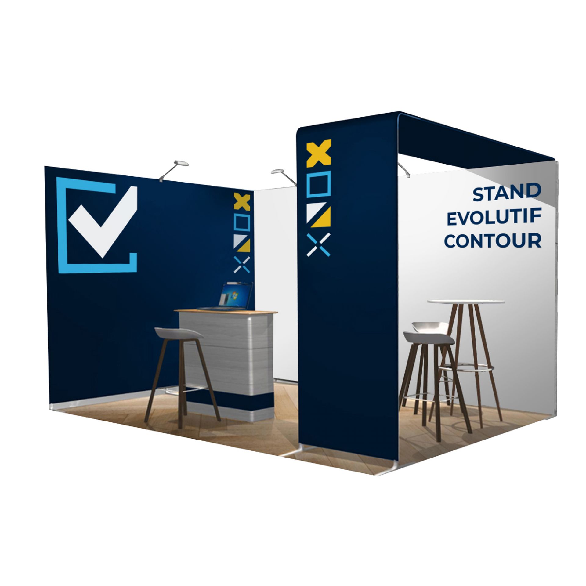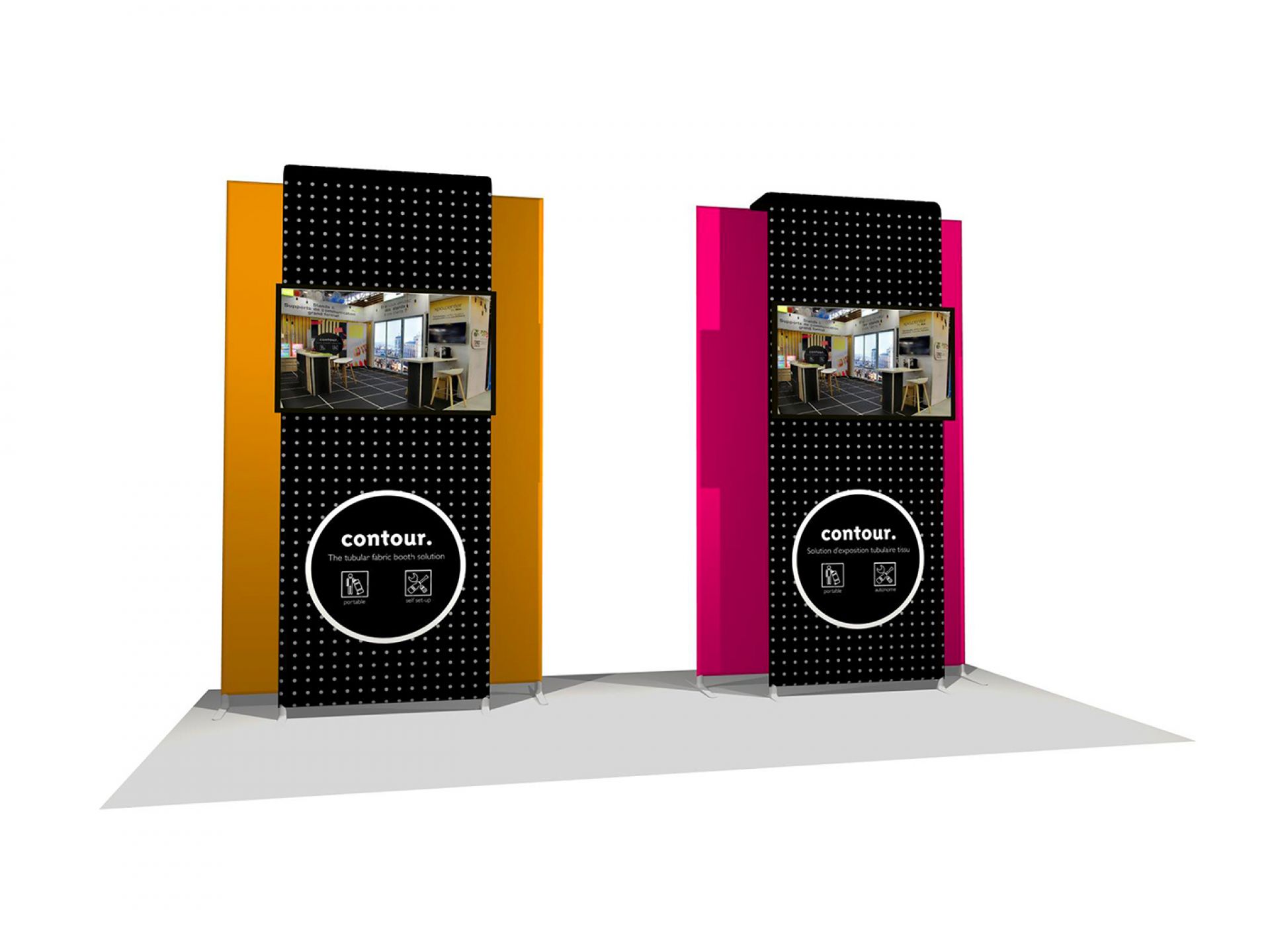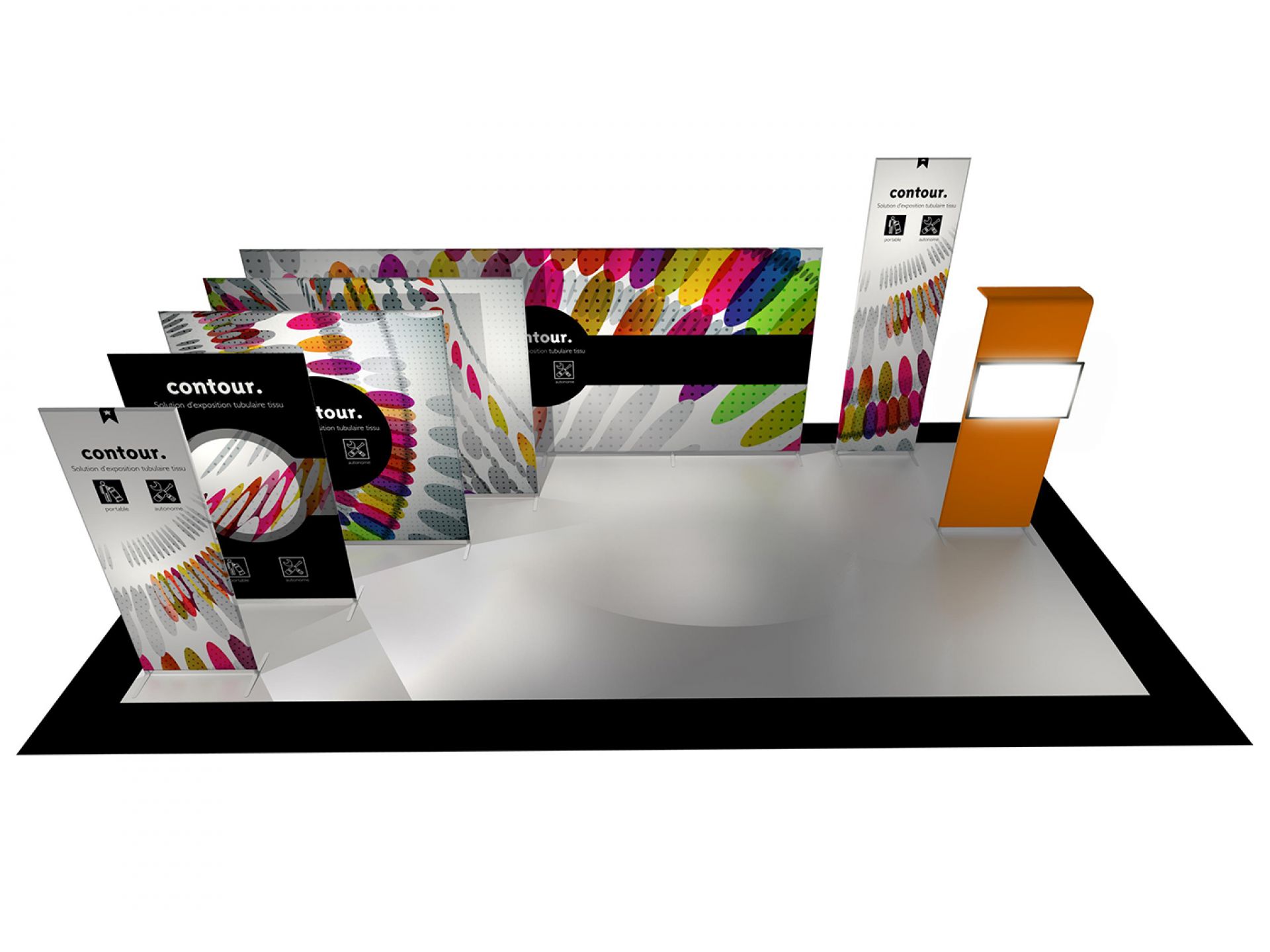 Le stand contour est une solution d’exposition évolutive et impactante. Sa structure en aluminium tubulaire s'habille d'un tissu imprimé extensible.