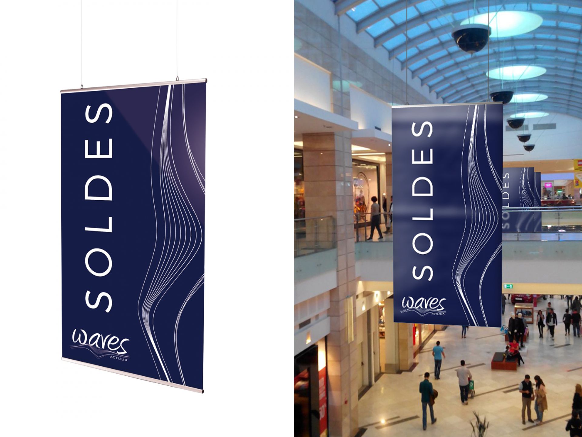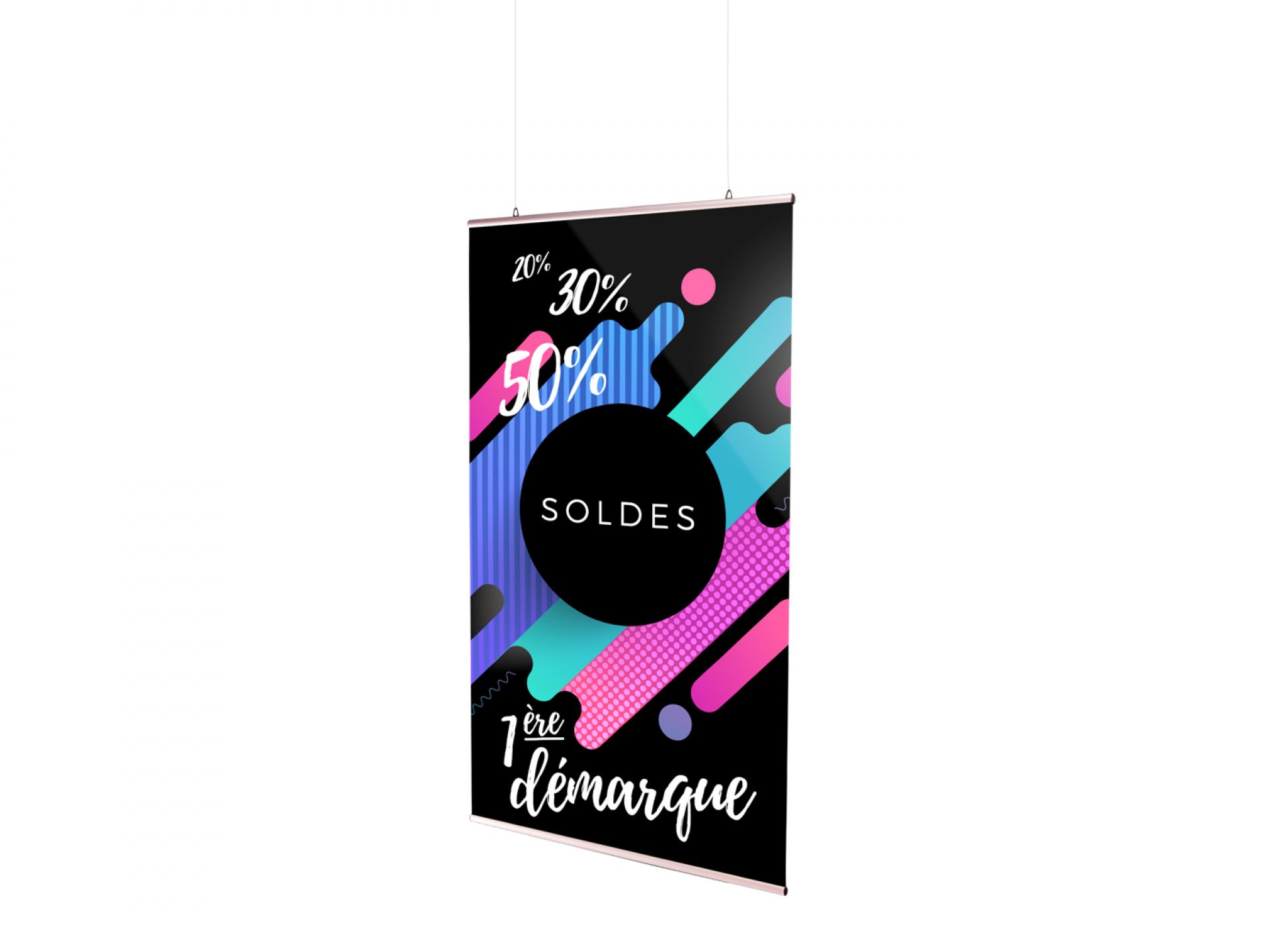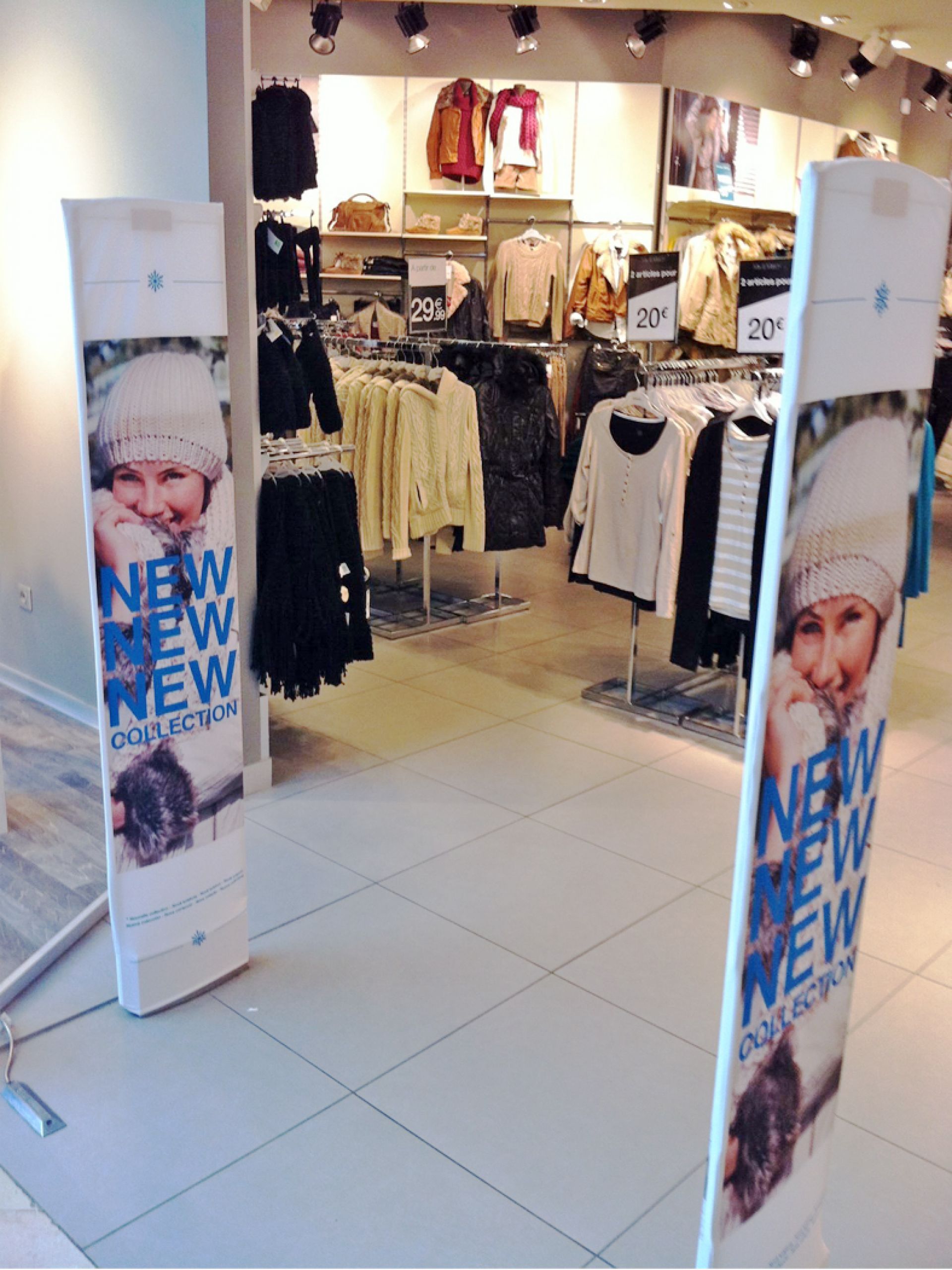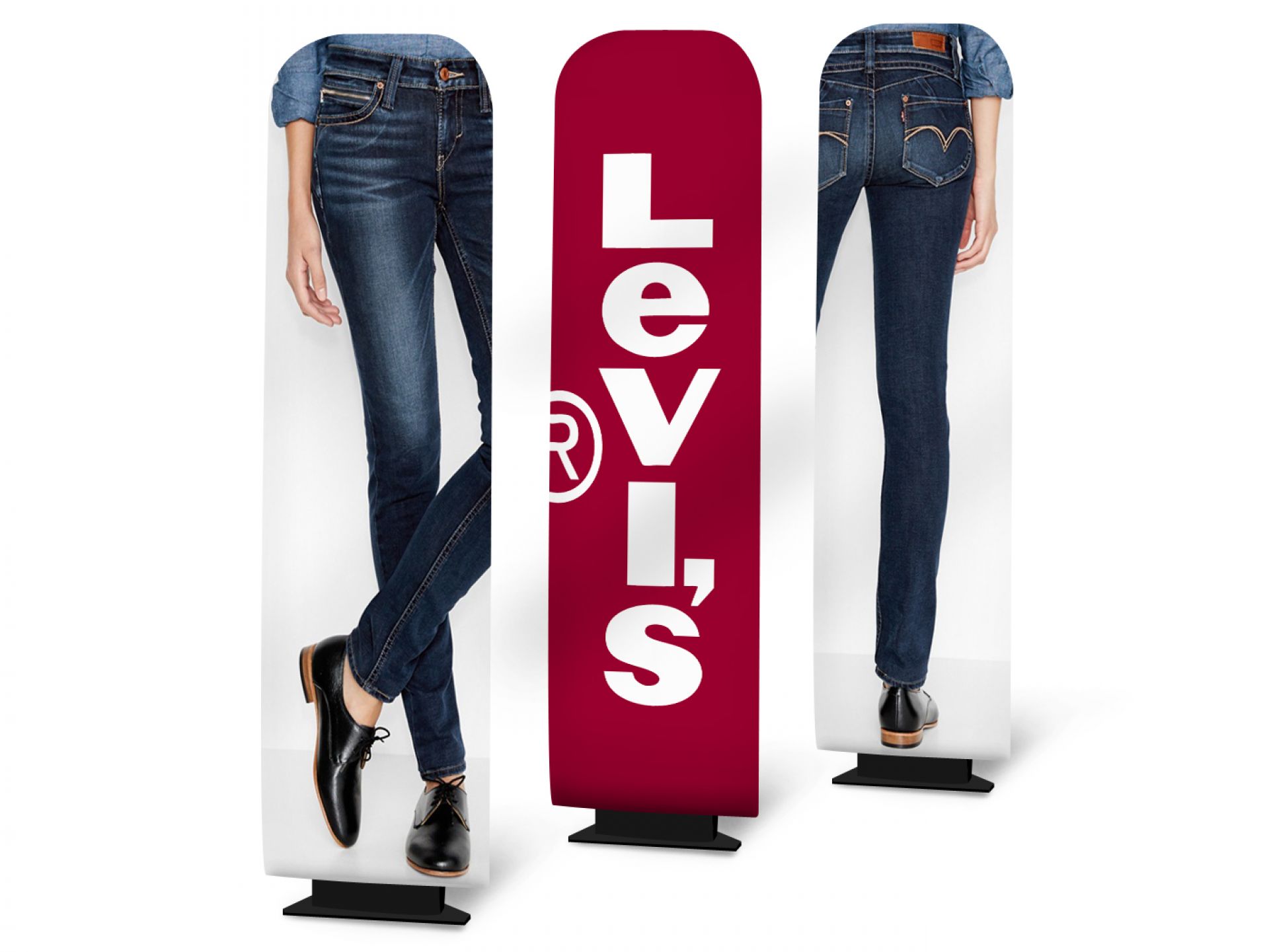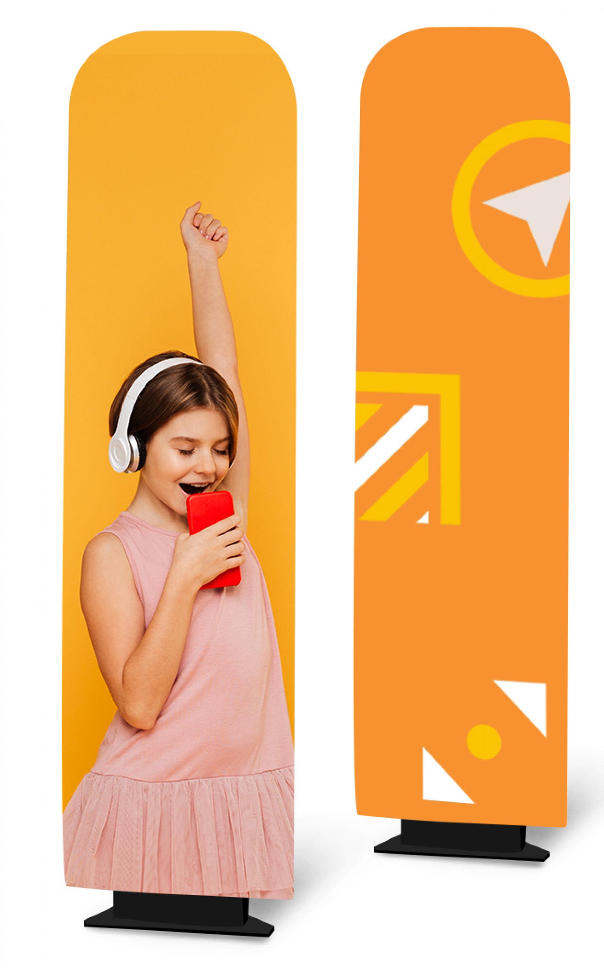 Le Vector Media est un totem polyvalent qui s’adapte à divers matériaux, du visuel textile au visuel PVC.