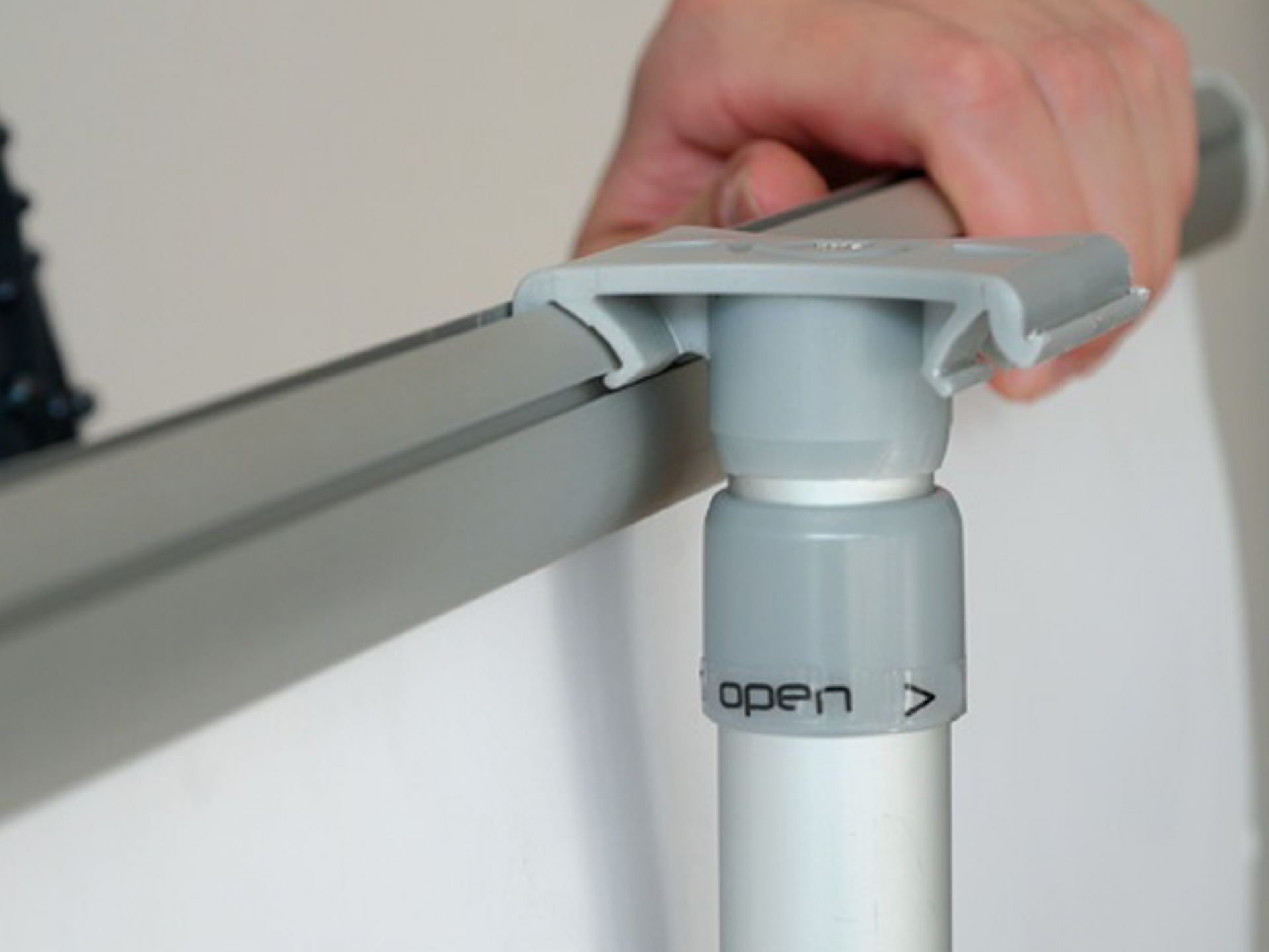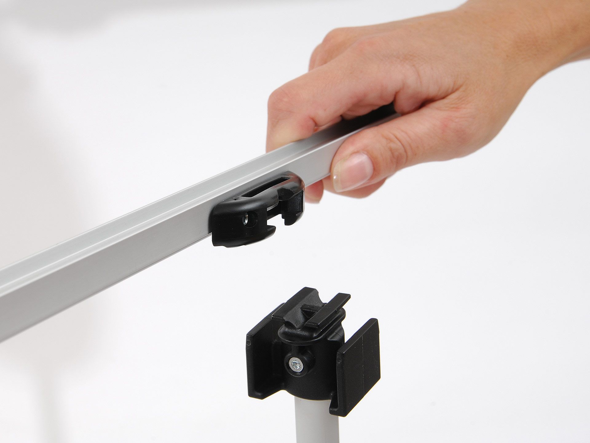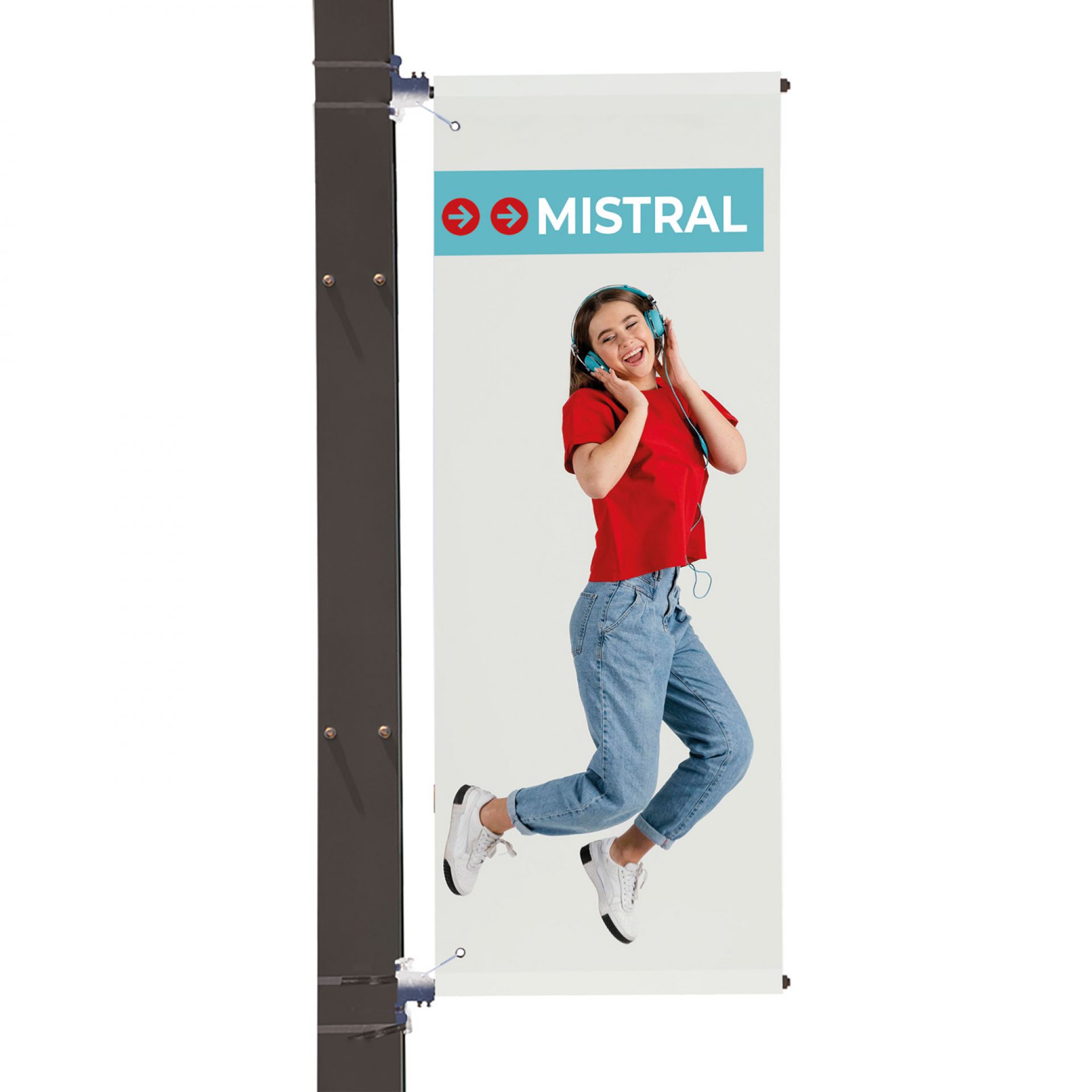 Le système se fixe sur un poteau ou un mur et s'ajuste pour s'adapter à différentes hauteurs de visuels.