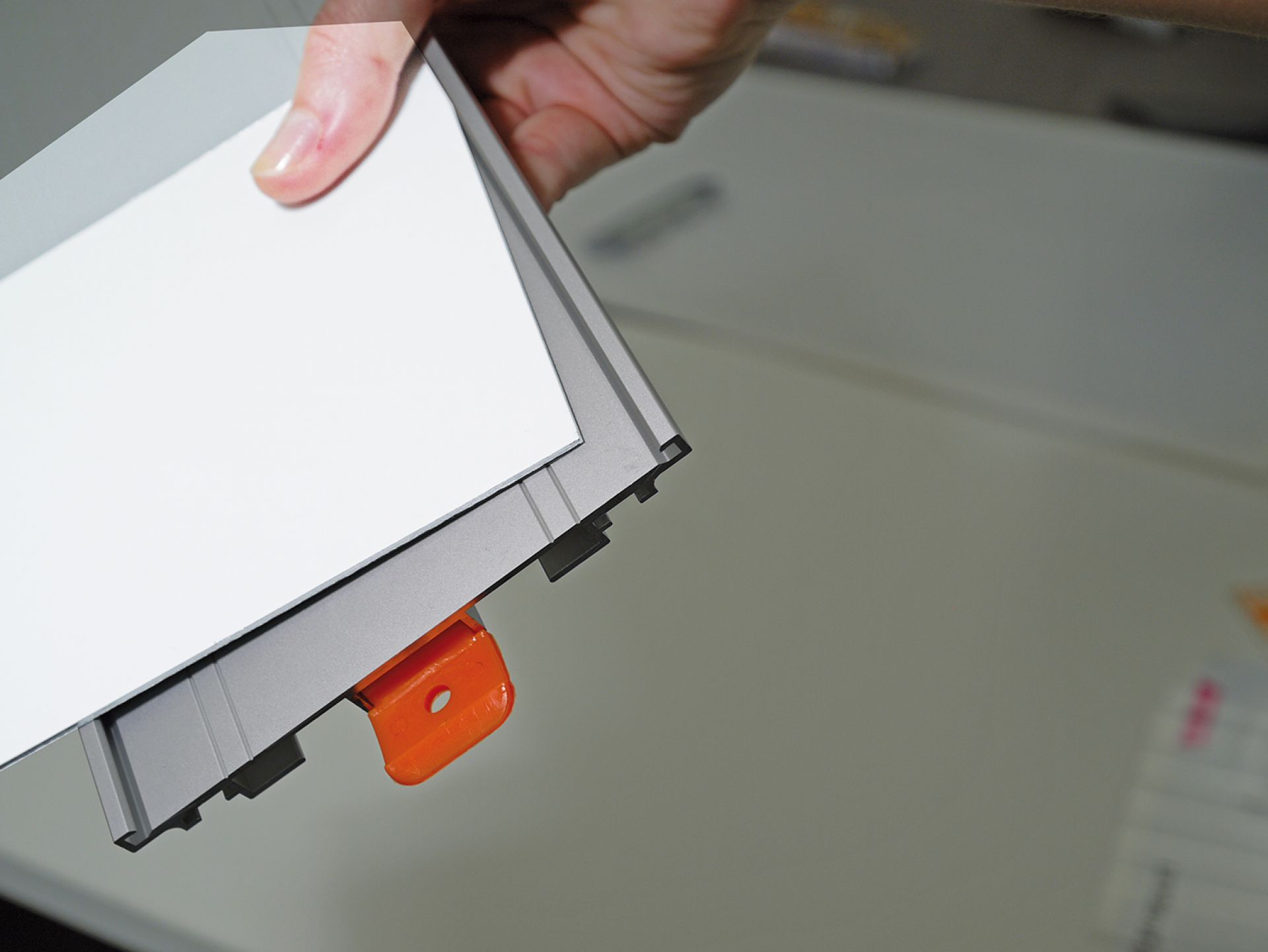 Les profilés peuvent accueillir un support en papier à insérer derrière une plaquette protectrice non-réfléchissante.