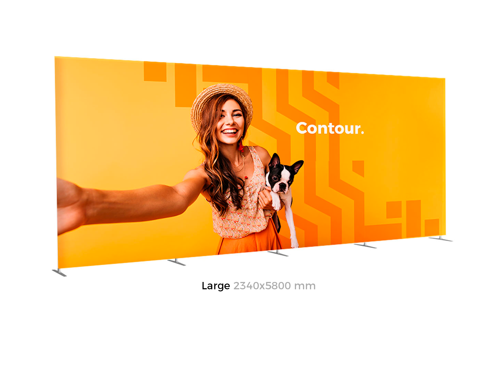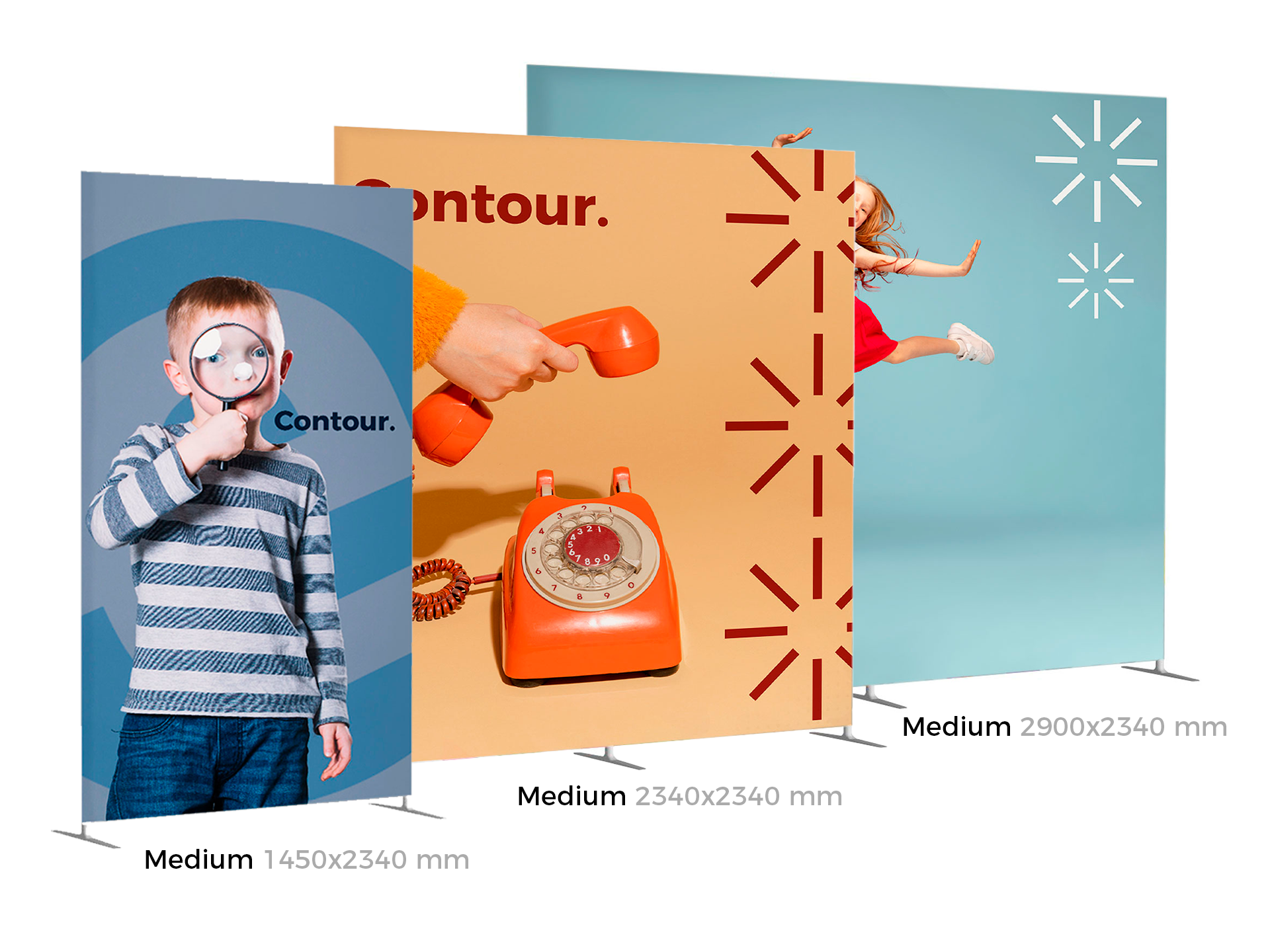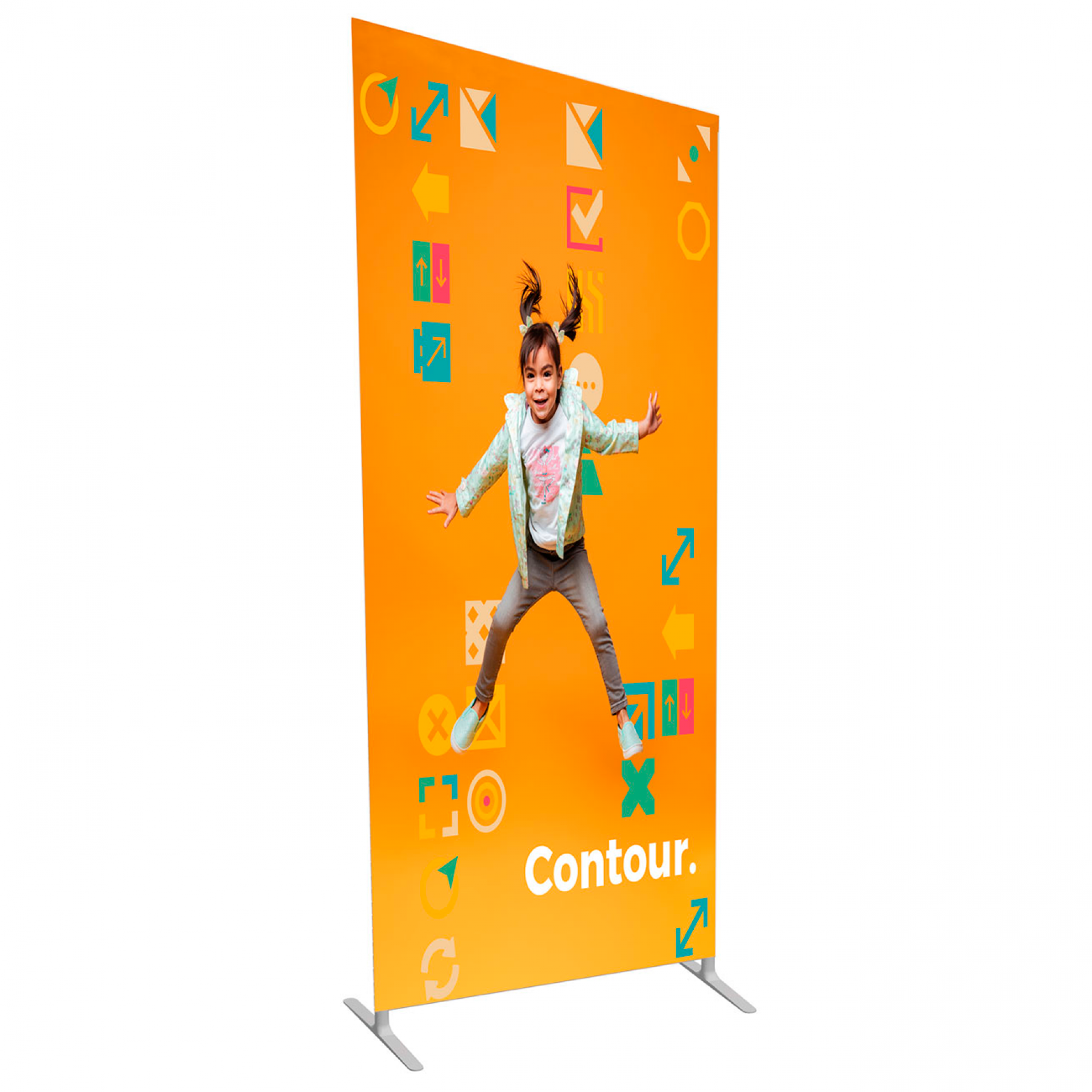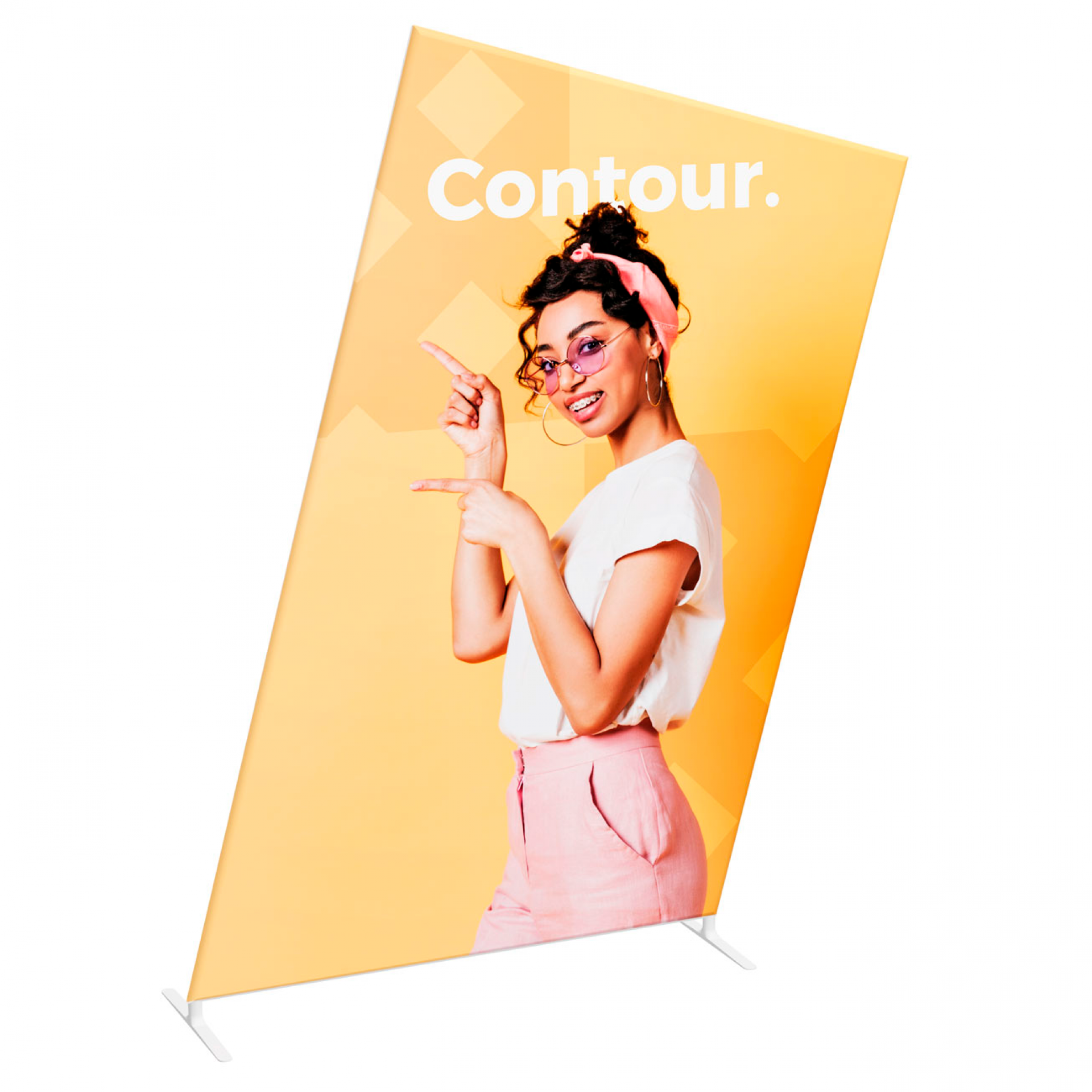 Contour est une gamme de cadres réalisée en structure aluminium tubulaire habillée d'un tissu extensible qui s'enfile comme une chaussette et recouvre l'intégralité de la structure.