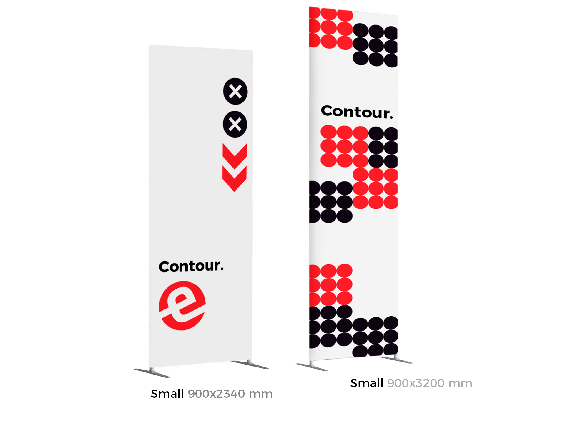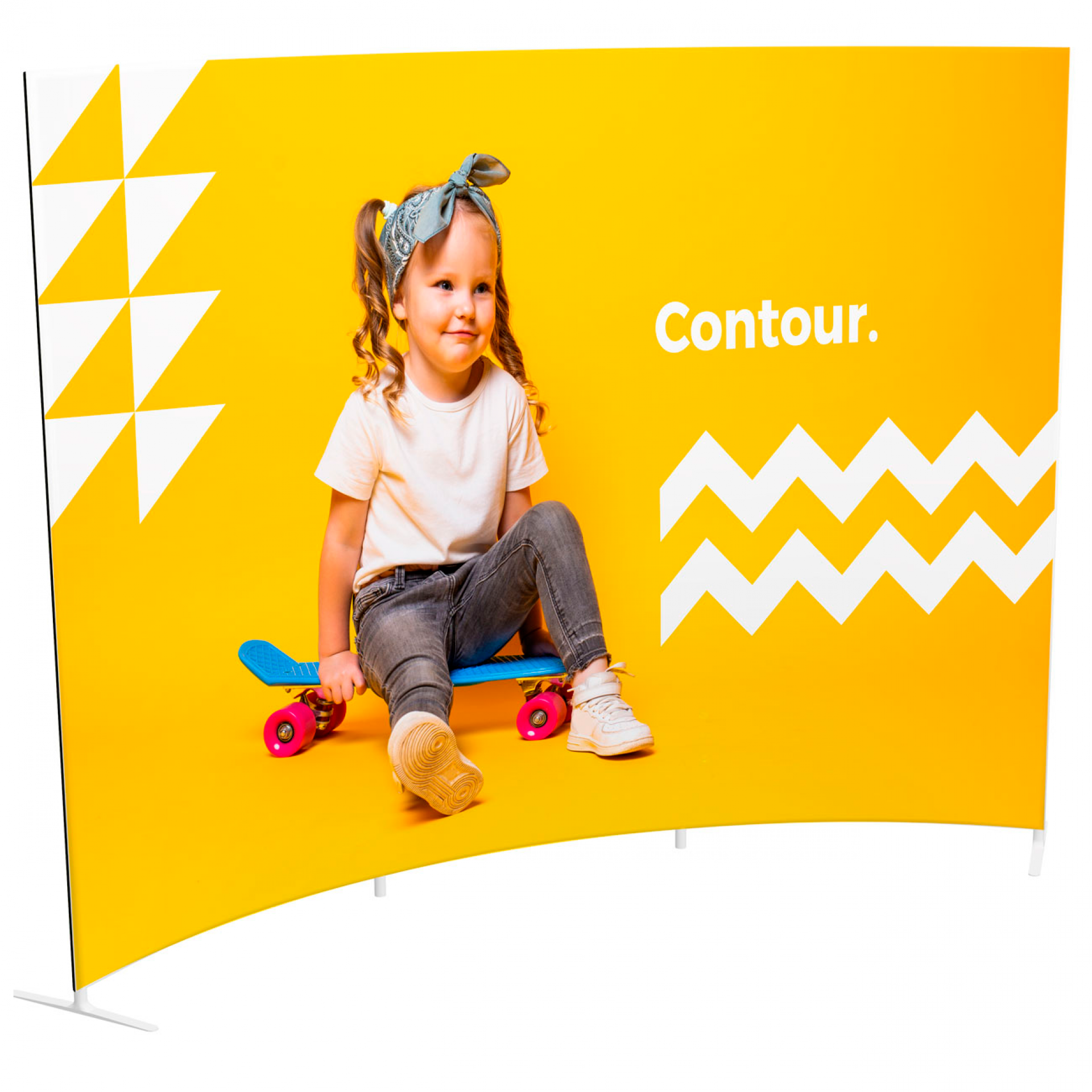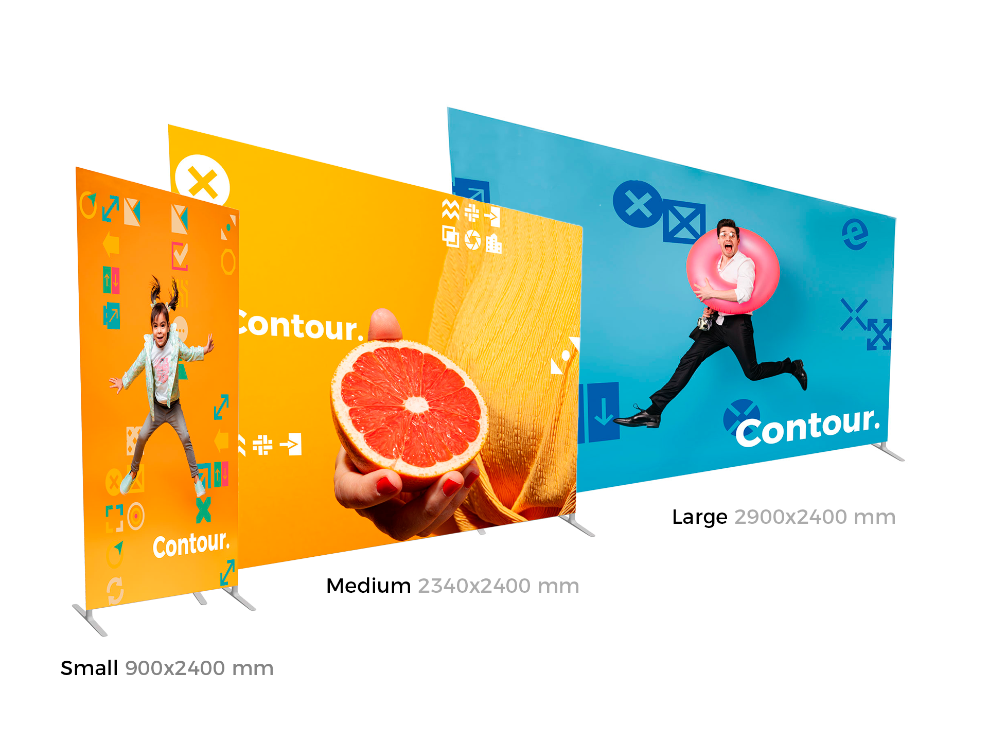 Contour est une gamme de cadres réalisée en structure aluminium tubulaire habillée d'un tissu extensible qui s'enfile comme une chaussette et recouvre l'intégralité de la structure.