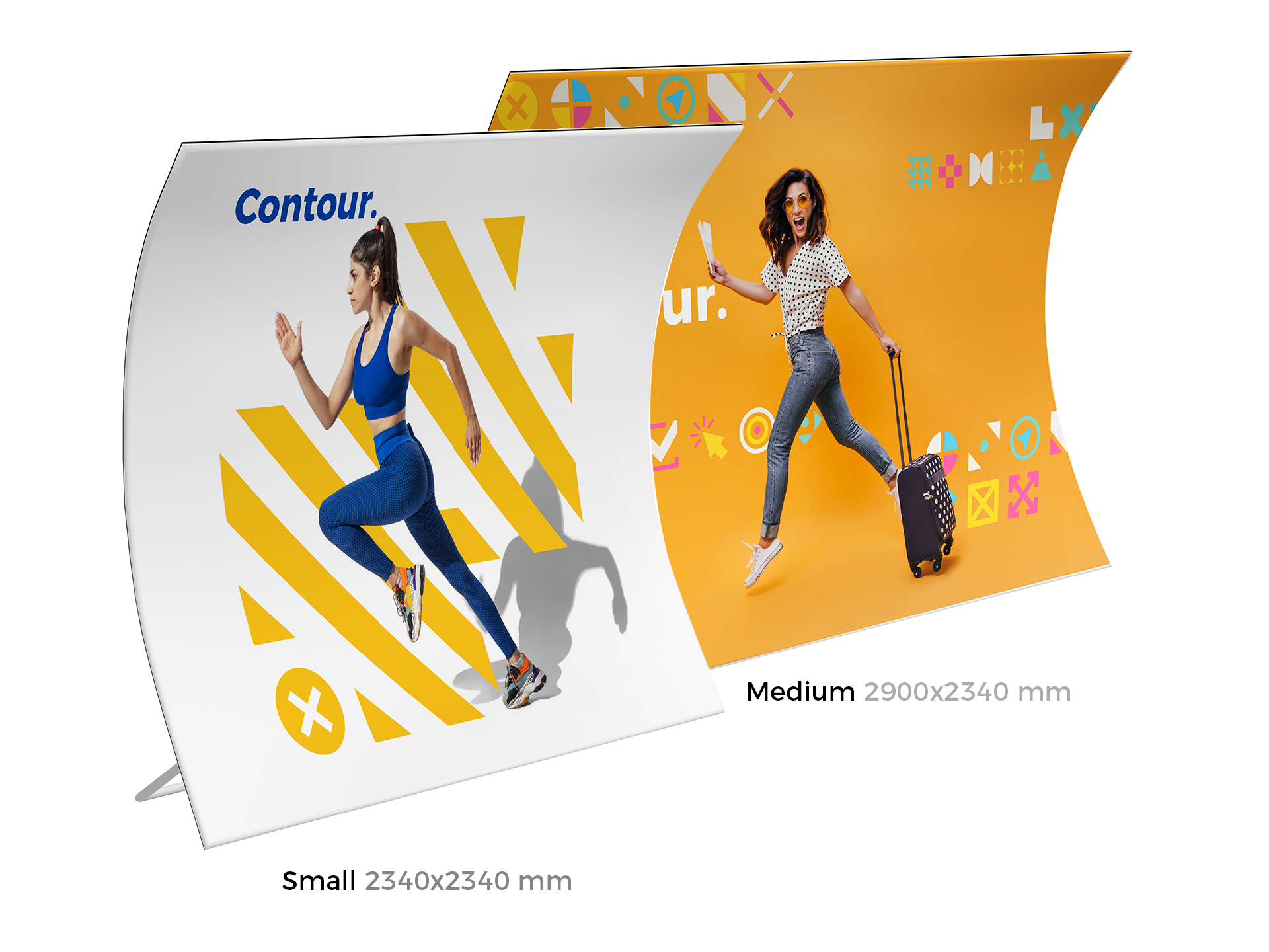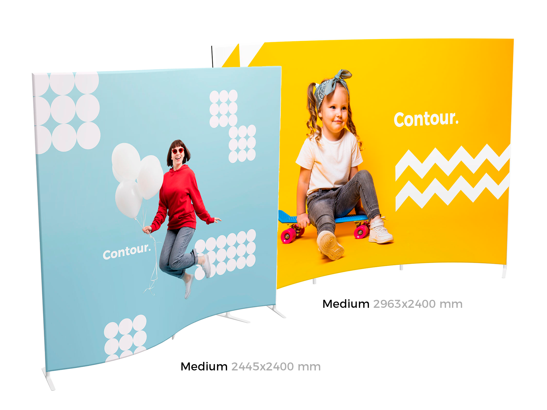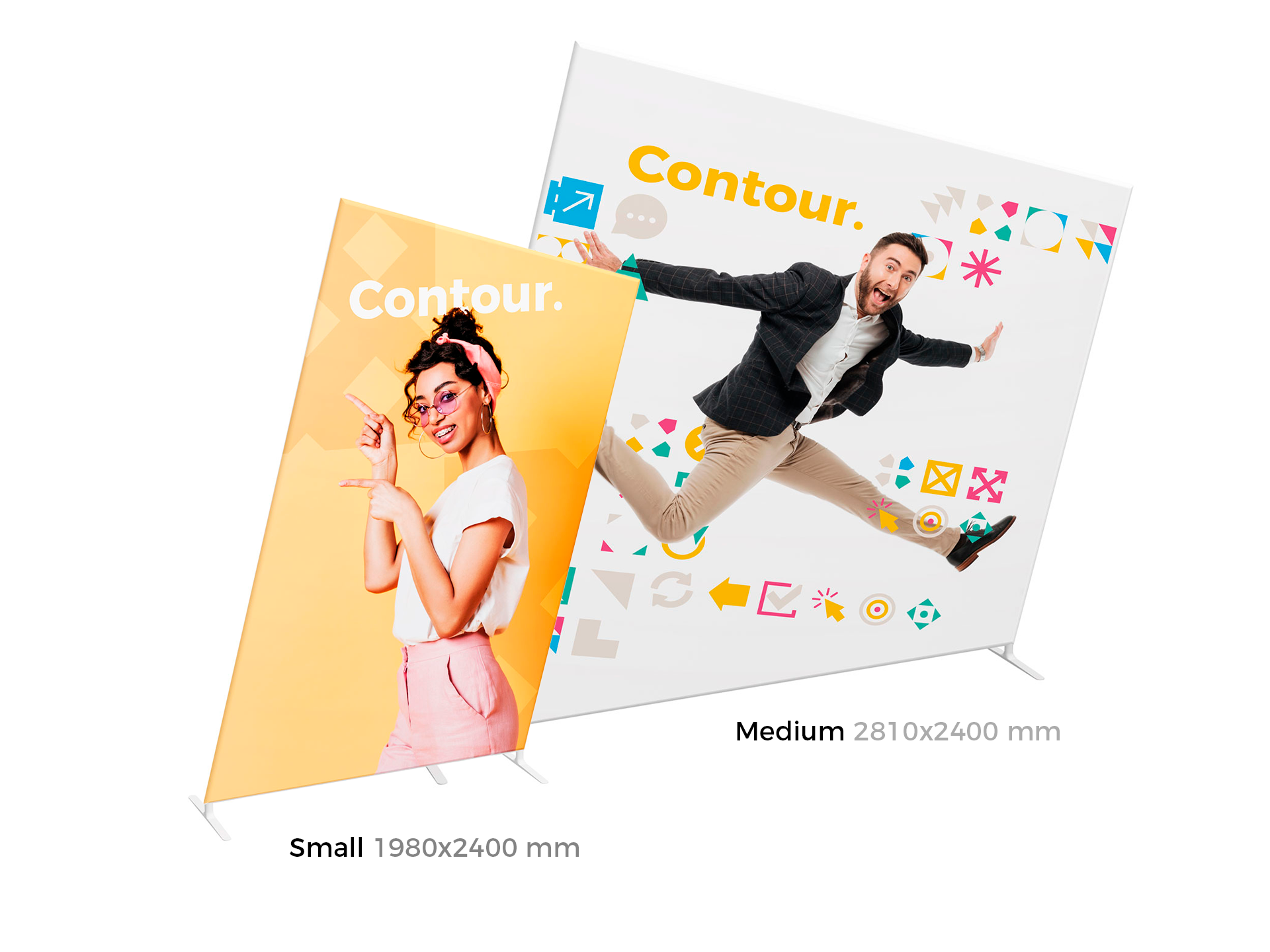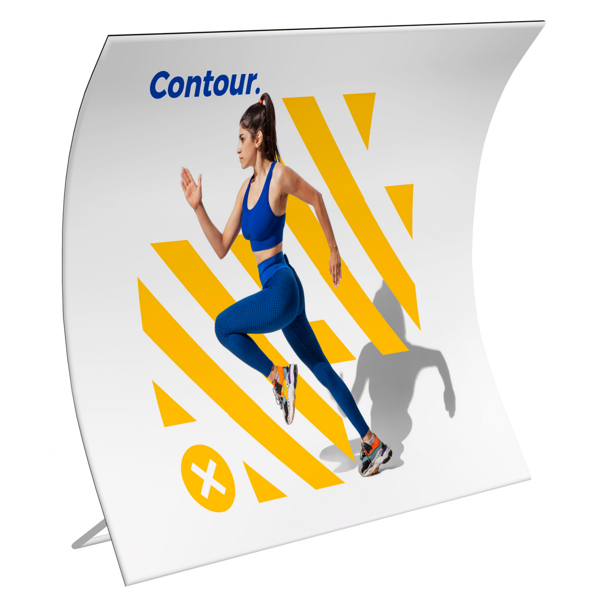 Contour est une gamme de cadres réalisée en structure aluminium tubulaire habillée d'un tissu extensible qui s'enfile comme une chaussette et recouvre l'intégralité de la structure.