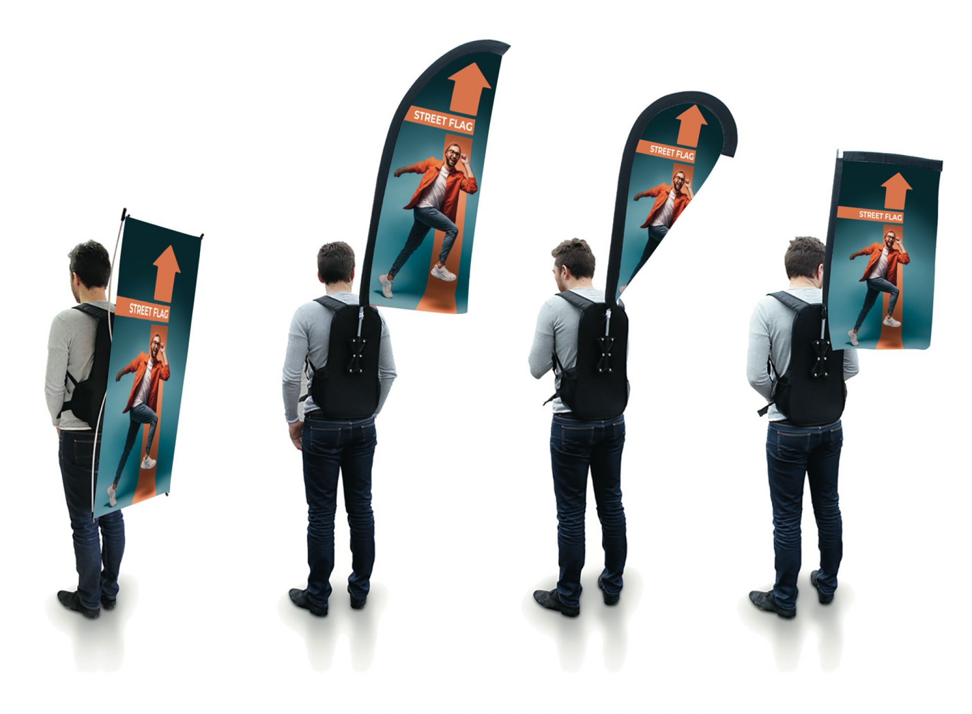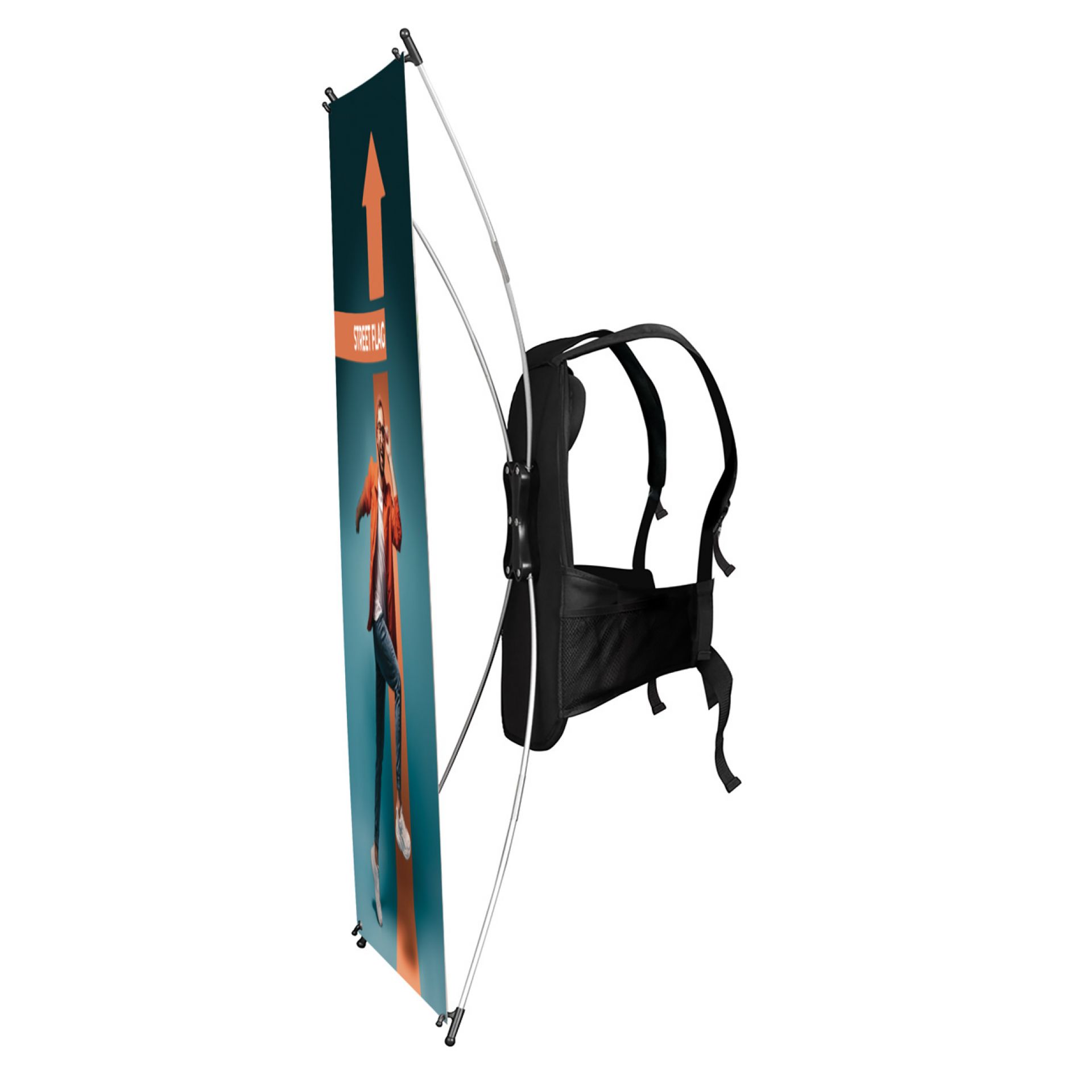 Street flag est un sac à dos avec structure porte-drapeaux ou totem.