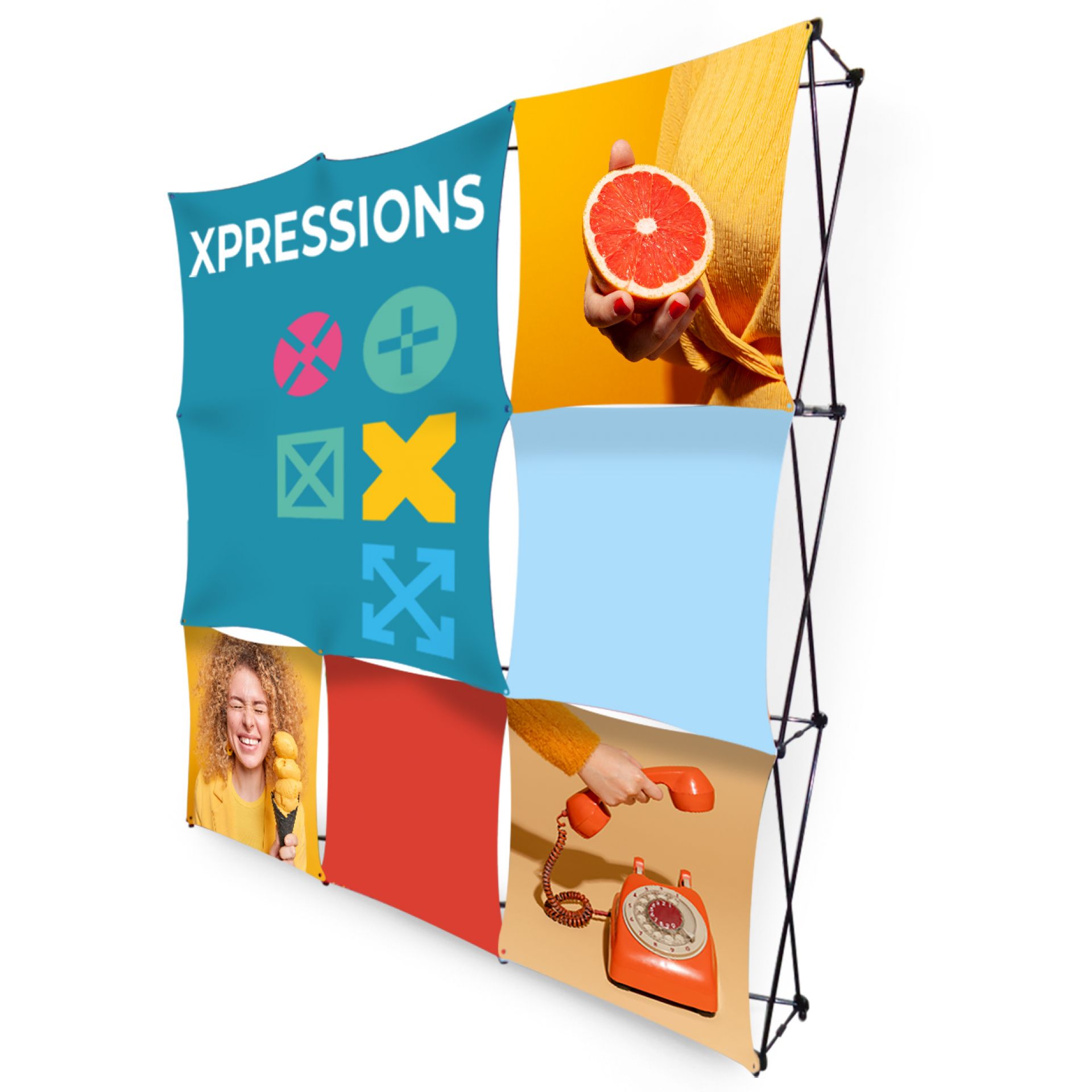 Le stand parapluie Xpressions est la solution d'affichage la plus créative. Ce stand vous offre la possibilité de joindre des visuels de toutes tailles sur deux niveaux de profondeur.