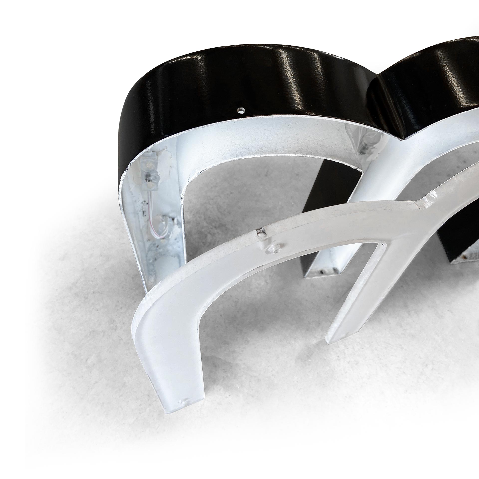 Le panneau de projection double-face Nova est composé d’un cadre incurvé en aluminium argenté, d’un bras de projection en aluminium, d’embouts en plastique gris et de films de couverture transparents en polycarbonate (brillant/mat).